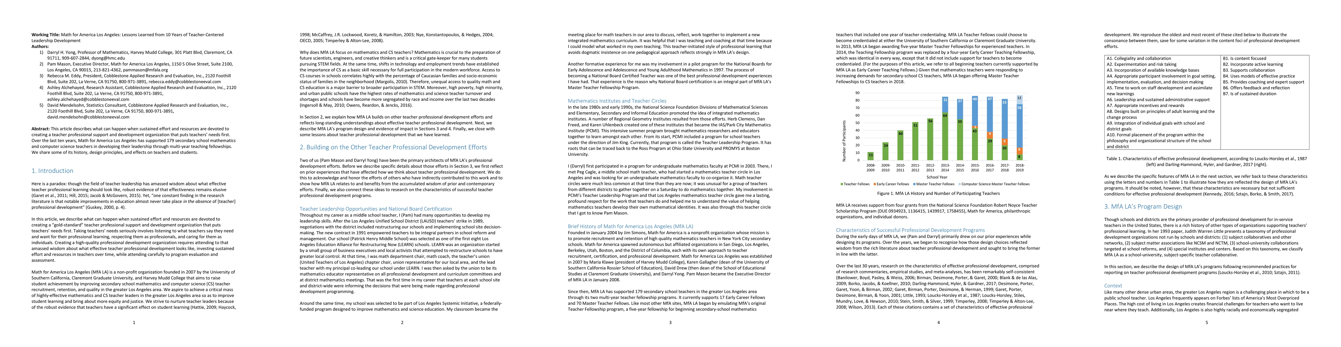 This article describes what can happen when sustained effort and resources are devoted to creating a teacher professional support and development organization that puts teachers' needs first. Over the last ten years, Math for America Los Angeles has supported 179 secondary school mathematics and computer science teachers in developing their leadership through multi-year teaching fellowships. We share some of its history, design principles, and effects on teachers and students.