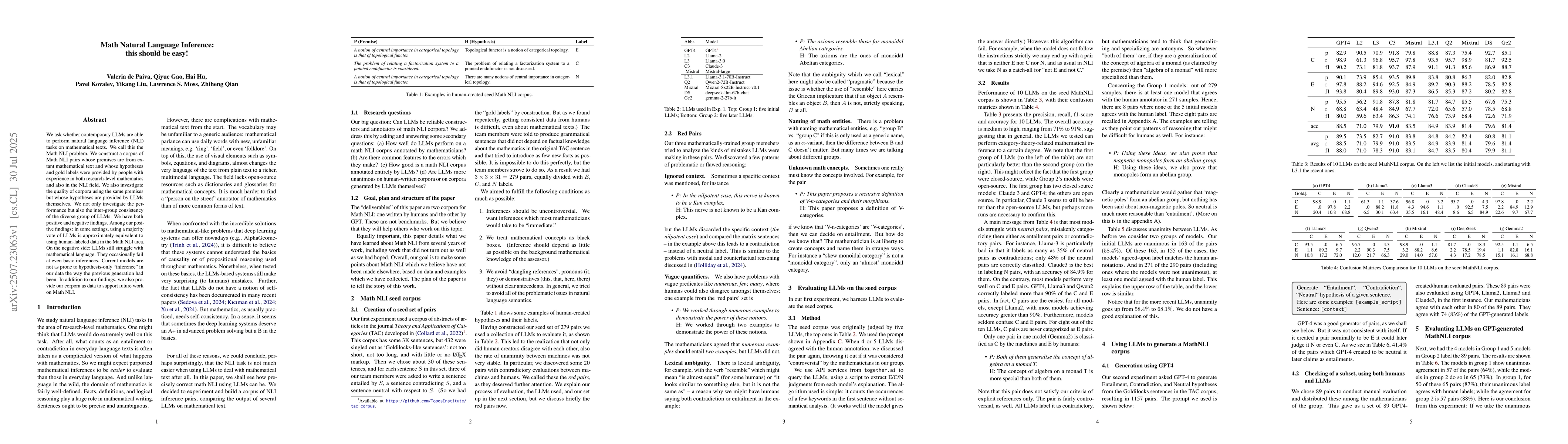 We ask whether contemporary LLMs are able to perform natural language inference (NLI) tasks on mathematical texts. We call this the Math NLI problem. We construct a corpus of Math NLI pairs whose premises are from extant mathematical text and whose hypotheses and gold labels were provided by people with experience in both research-level mathematics and also in the NLI field. We also investigate the quality of corpora using the same premises but whose hypotheses are provided by LLMs themselves. We not only investigate the performance but also the inter-group consistency of the diverse group of LLMs. We have both positive and negative findings. Among our positive findings: in some settings, using a majority vote of LLMs is approximately equivalent to using human-labeled data in the Math NLI area. On the negative side: LLMs still struggle with mathematical language. They occasionally fail at even basic inferences. Current models are not as prone to hypothesis-only "inference" in our data the way the previous generation had been. In addition to our findings, we also provide our corpora as data to support future work on Math NLI.