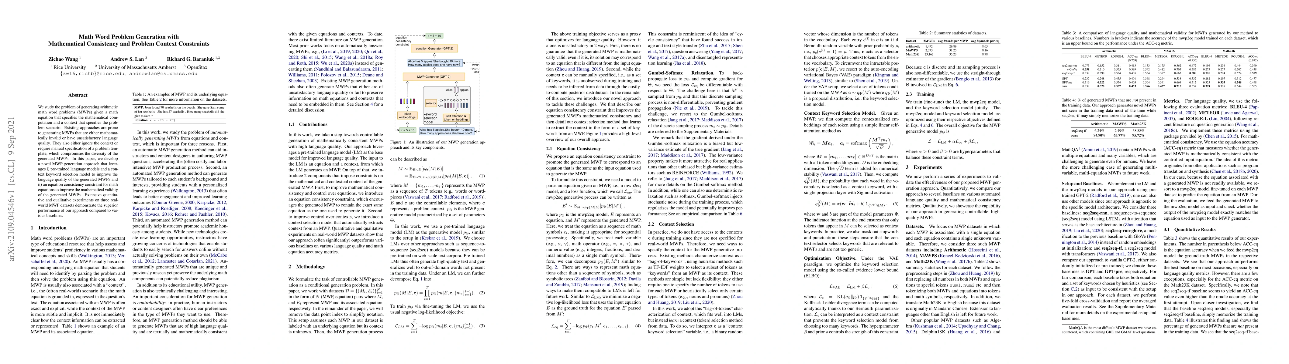 We study the problem of generating arithmetic math word problems (MWPs) given a math equation that specifies the mathematical computation and a context that specifies the problem scenario. Existing approaches are prone to generating MWPs that are either mathematically invalid or have unsatisfactory language quality. They also either ignore the context or require manual specification of a problem template, which compromises the diversity of the generated MWPs. In this paper, we develop a novel MWP generation approach that leverages i) pre-trained language models and a context keyword selection model to improve the language quality of the generated MWPs and ii) an equation consistency constraint for math equations to improve the mathematical validity of the generated MWPs. Extensive quantitative and qualitative experiments on three real-world MWP datasets demonstrate the superior performance of our approach compared to various baselines.