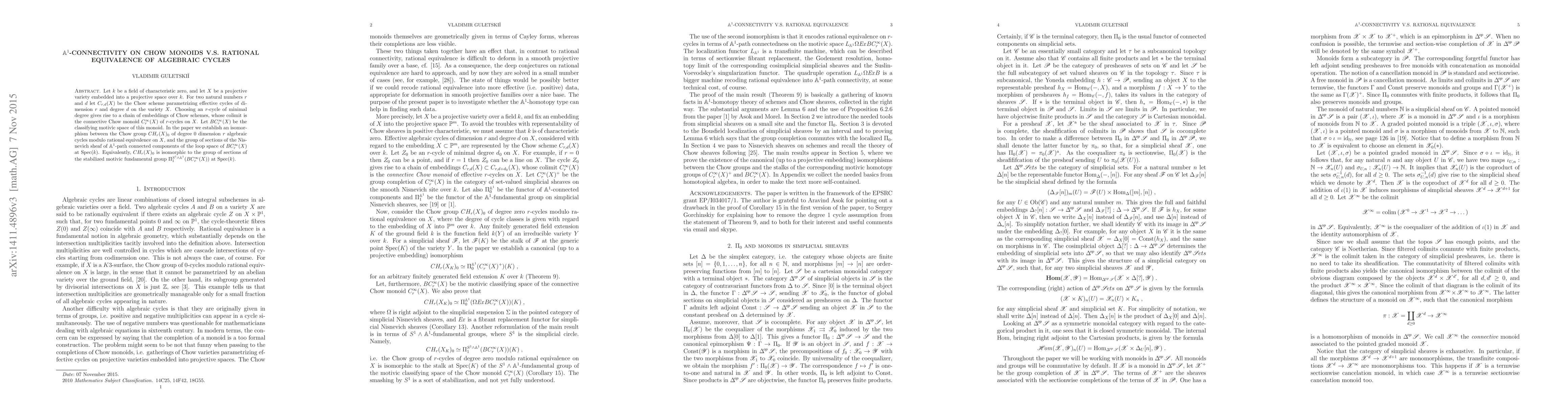 Let $k$ be a field of characteristic zero, and let $X$ be a projective variety embedded into a projective space over $k$. For two natural numbers $r$ and $d$ let $C_{r,d}(X)$ be the Chow scheme parametrizing effective cycles of dimension $r$ and degree $d$ on the variety $X$. An effective $r$-cycle of minimal degree on $X$ gives rise to a chain of embeddings of $C_{r,d}(X)$ into $C_{r,d+1}(X)$, whose colimit is the connective Chow monoid $C_r^{\infty }(X)$ of $r$-cycles on $X$. Let $BC_r^{\infty }(X)$ be the motivic classifying space of this monoid. In the paper we establish an isomorphism between the Chow group $CH_r(X)_0$ of degree $0$ dimension $r$ algebraic cycles modulo rational equivalence on $X$, and the group of sections of the sheaf of $\mathbb A^1$-path connected components of the loop space of $BC_r^{\infty }(X)$ at $Spec(k)$. Equivalently, $CH_r(X)_0$ is isomorphic to the group of sections of the $S^1\wedge \mathbb A^1$-fundamental group $\Pi _1^{S^1\wedge \mathbb A^1}(BC_r^{\infty }(X))$ at $Spec(k)$.