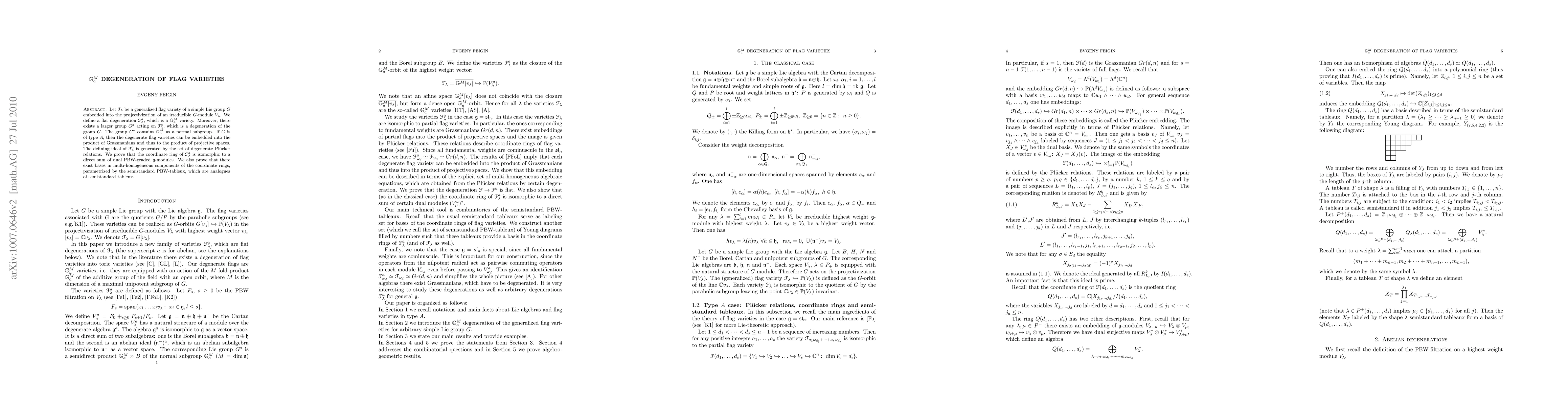 The paper introduces a novel method for degenerating flag varieties using the group ${\mathbb G}_a^M$ and a larger acting group $G^a$, along with a detailed analysis of the coordinate ring structure under this degeneration.
