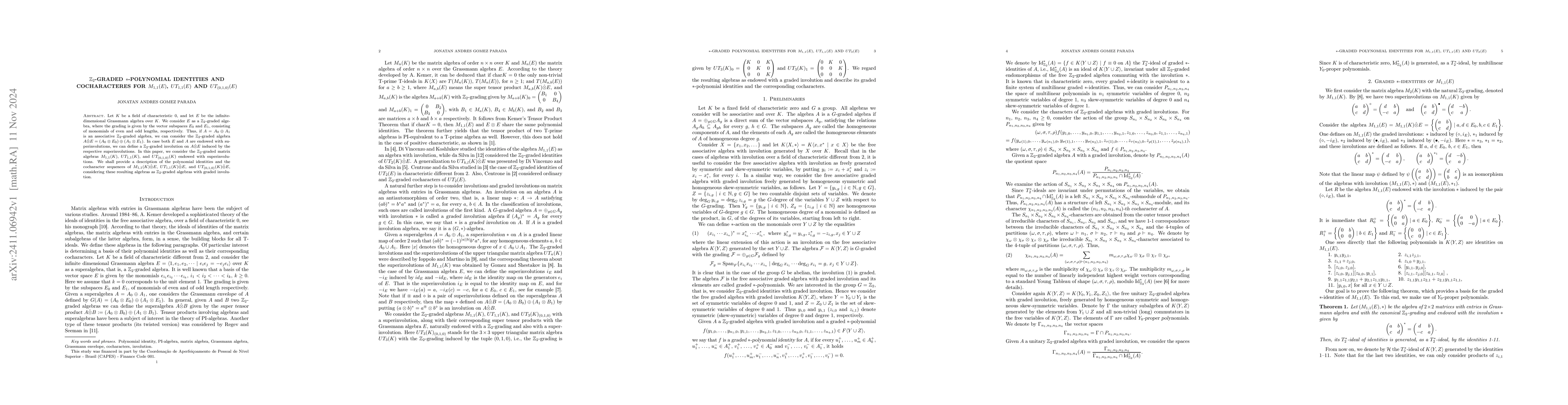 Let $K$ be a field of characteristic 0, and let $E$ be the infinite-dimensional Grassmann algebra over $K$. We consider $E$ as a $\mathbb{Z}_2$-graded algebra, where the grading is given by the vector subspaces $E_0$ and $E_1$, consisting of monomials of even and odd lengths, respectively. Thus, if $A = A_0 \oplus A_1$ is an associative $\mathbb{Z}_2$-graded algebra, we can consider the $\mathbb{Z}_2$-graded algebra $A \hat{\otimes} E = (A_0 \otimes E_0) \oplus (A_1 \otimes E_1)$. In case both $E$ and $A$ are endowed with superinvolutions, we can define a $\mathbb{Z}_2$-graded involution on $A \hat{\otimes} E$ induced by the respective superinvolutions. In this paper, we consider the $\mathbb{Z}_2$-graded matrix algebras $M_{1,1}(K)$, $UT_{1,1}(K)$, and $UT_{(0,1,0)}(K)$ endowed with superinvolutions. We shall provide a description of the polynomial identities and the cocharacter sequences of $M_{1,1}(K)\hat{\otimes} E$, $UT_{1,1}(K)\hat{\otimes} E$, and $UT_{(0,1,0)}(K)\hat{\otimes} E$, considering these resulting algebras as $\mathbb{Z}_2$-graded algebras with graded involution.