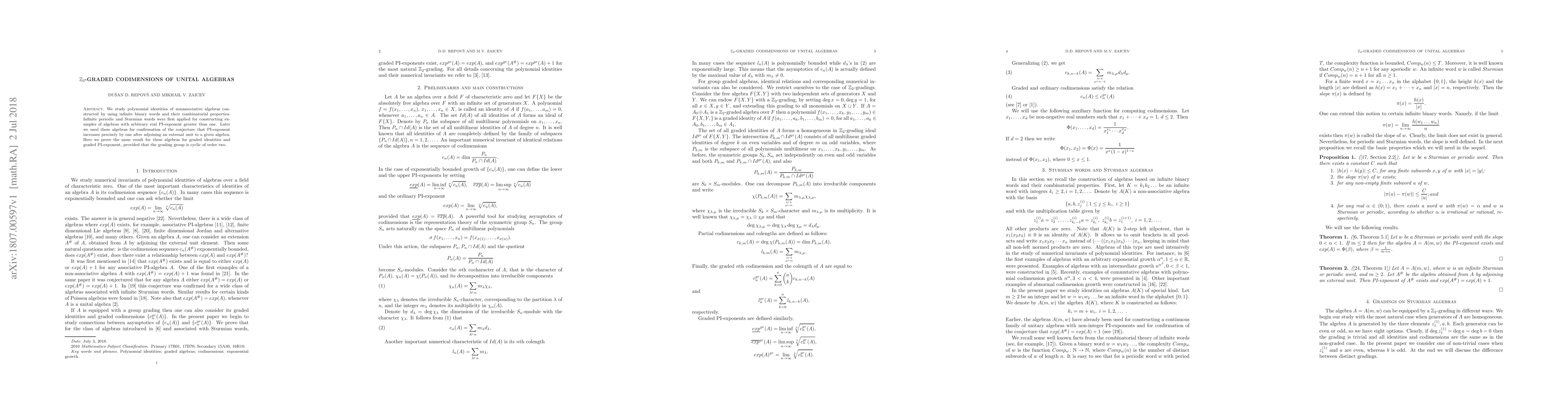 This paper explores polynomial identities in nonassociative algebras built from infinite binary words, confirming that the PI-exponent increases by one when an external unit is added, specifically for $\mathbb Z_2$-graded codimensions. The study focuses on the combinatorial properties of these algebras and their infinite periodic and Sturmian word constructions.