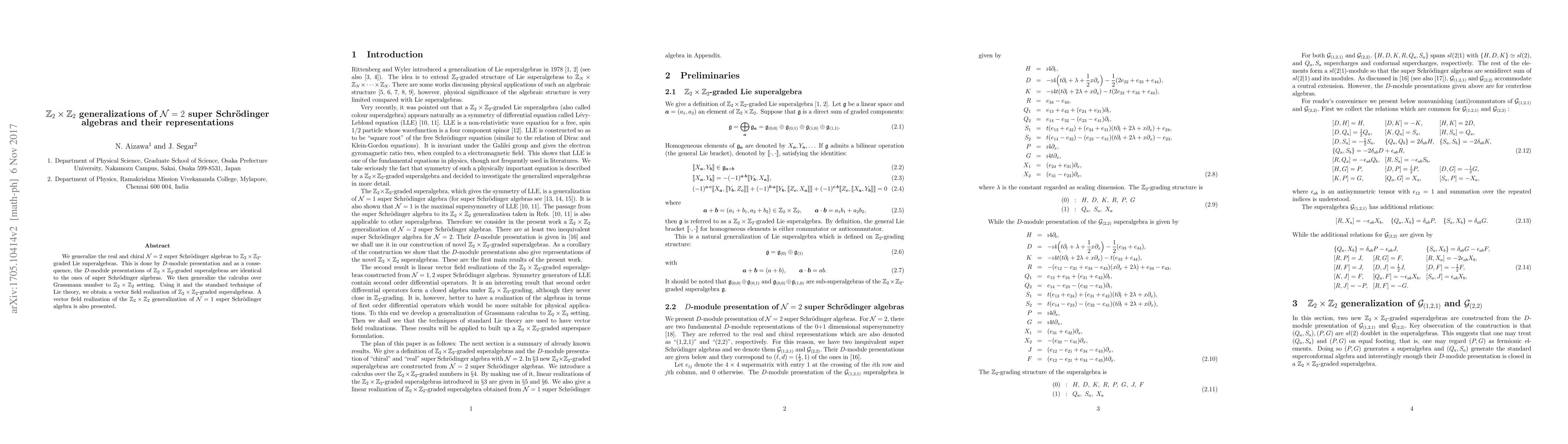 We generalize the real and chiral $ {\cal N} =2 $ super Schr\"odinger algebras to ${\mathbb Z}_2 \times {\mathbb Z}_2$-graded Lie superalgebras. This is done by $D$-module presentation and as a consequence, the $D$-module presentations of ${\mathbb Z}_2 \times {\mathbb Z}_2$-graded superalgebras are identical to the ones of super Schr\"odinger algebras. We then generalize the calculus over Grassmann number to ${\mathbb Z}_2 \times {\mathbb Z}_2 $ setting. Using it and the standard technique of Lie theory, we obtain a vector field realization of ${\mathbb Z}_2 \times {\mathbb Z}_2$-graded superalgebras. A vector field realization of the ${\mathbb Z}_2 \times {\mathbb Z}_2 $ generalization of ${\cal N} = 1 $ super Schr\"odinger algebra is also presented.