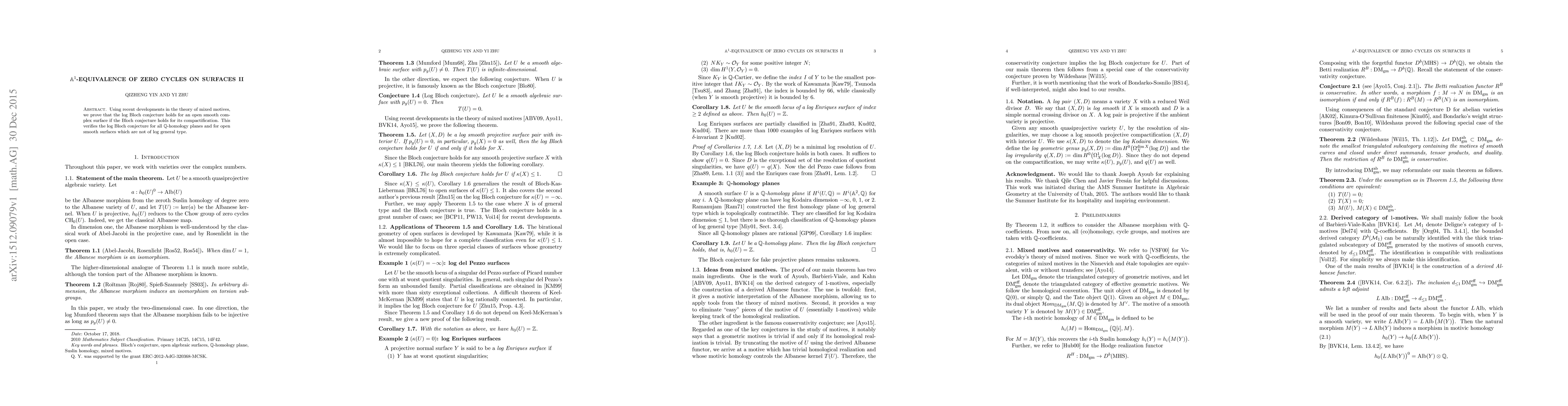Using recent developments in the theory of mixed motives, we prove that the log Bloch conjecture holds for an open smooth complex surface if the Bloch conjecture holds for its compactification. This verifies the log Bloch conjecture for all $\mathbb{Q}$-homology planes and for open smooth surfaces which are not of log general type.