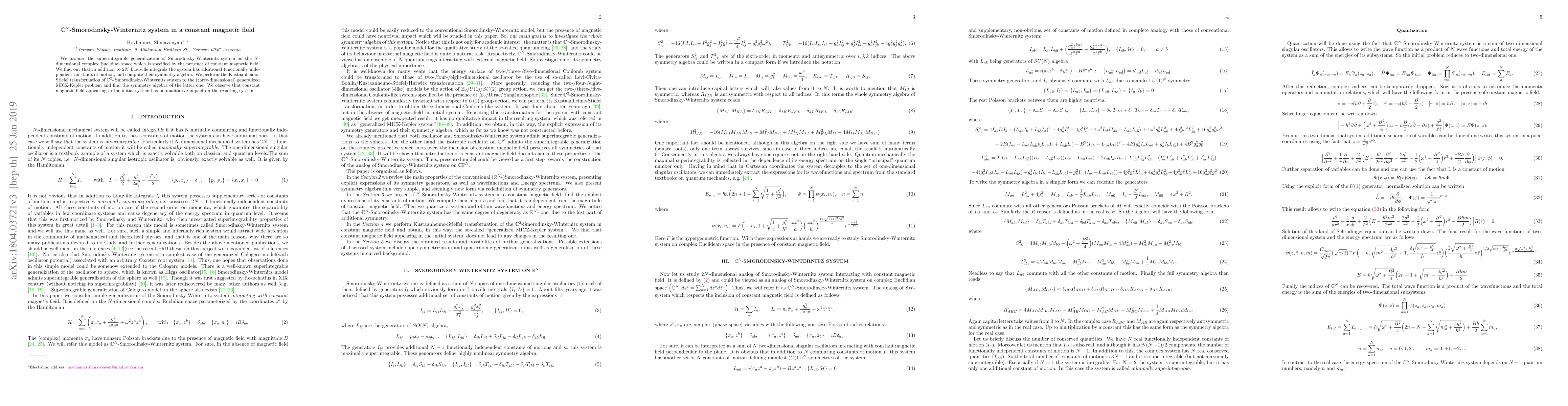 This paper generalizes the Smorodinsky-Winternitz system to an $N$-dimensional complex Euclidean space under a constant magnetic field, discovering additional independent constants of motion beyond the $2N$ Liouville integrals. The $\mathbb{C}^2$ version is transformed into a three-dimensional generalized MICZ-Kepler problem, revealing that the magnetic field does not significantly affect the symmetry algebra.