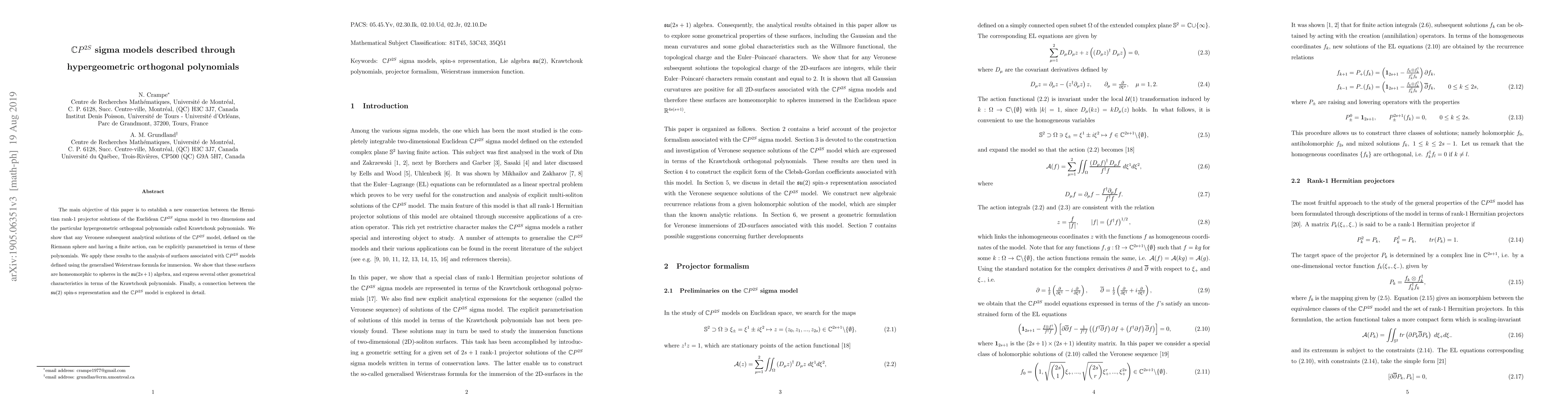 Researchers establish a connection between Hermitian rank-1 projector solutions of the Euclidean CP^{2S} sigma model and hypergeometric orthogonal polynomials, specifically Krawtchouk polynomials, which helps analyze surfaces associated with these models.