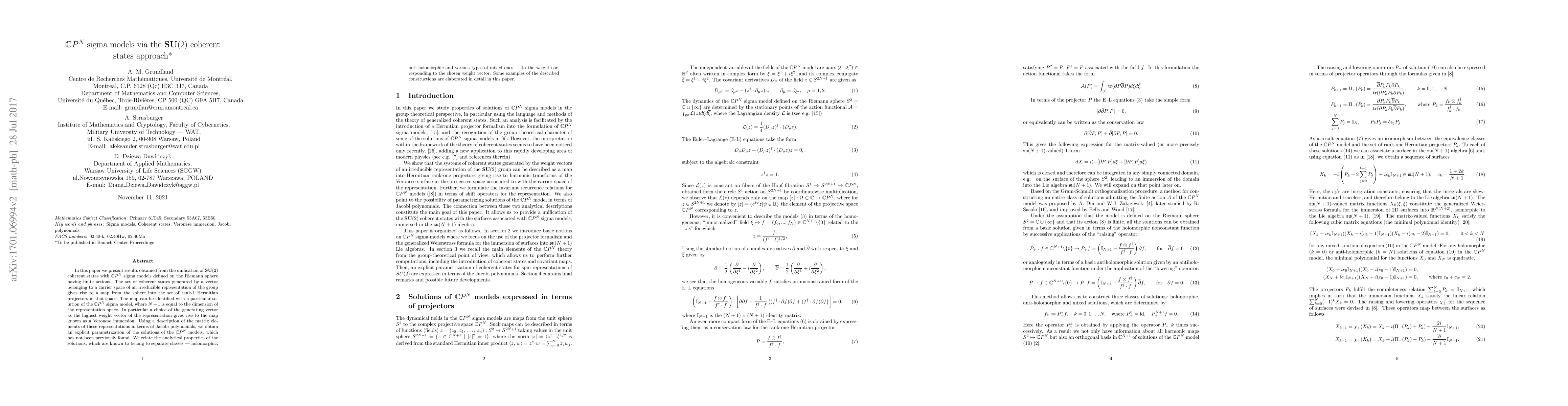 This paper unifies $SU(2)$ coherent states with $\mathbb{C}P^N$ sigma models on the Riemann sphere, providing a novel explicit parametrization of their solutions using Jacobi polynomials and relating their analytical properties to the chosen highest weight vector.