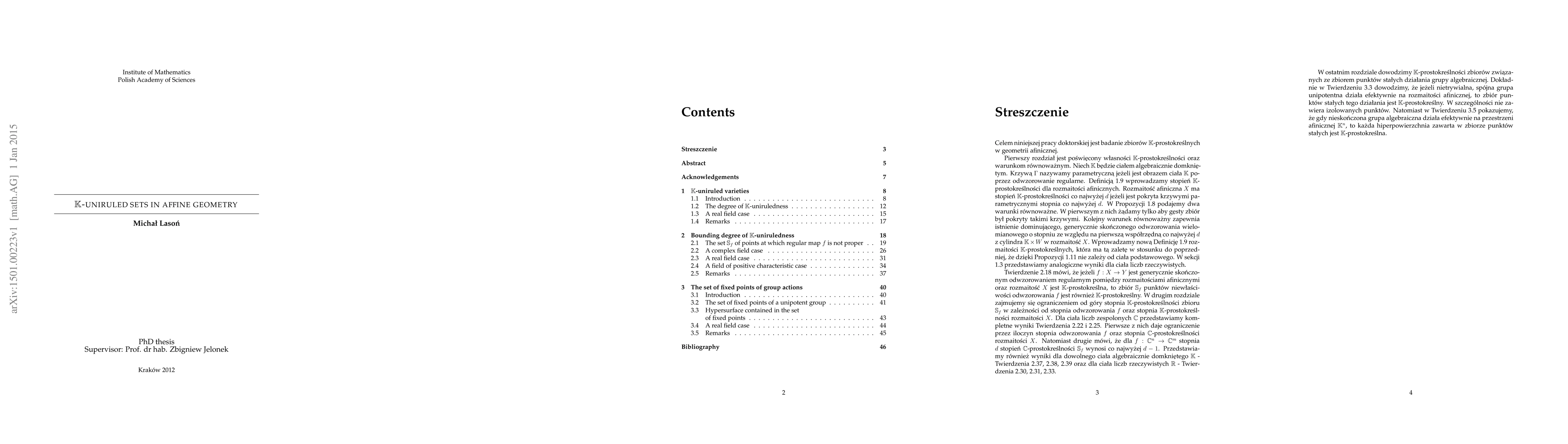 The main goal of this thesis is to study $\mathbb{K}$-uniruled sets that appear in affine geometry. At the beginning we discuss the property of $\mathbb{K}$-uniruledness and its equivalent conditions. Then we bound from above the degree of $\mathbb{K}$-uniruledness of the non-properness set of a polynomial map in terms of its degree and degree of $\mathbb{K}$-uniruledness of the domain variety. At the end we show that some sets associated with the set of fixed points of an algebraic group action are $\mathbb{K}$-uniruled.