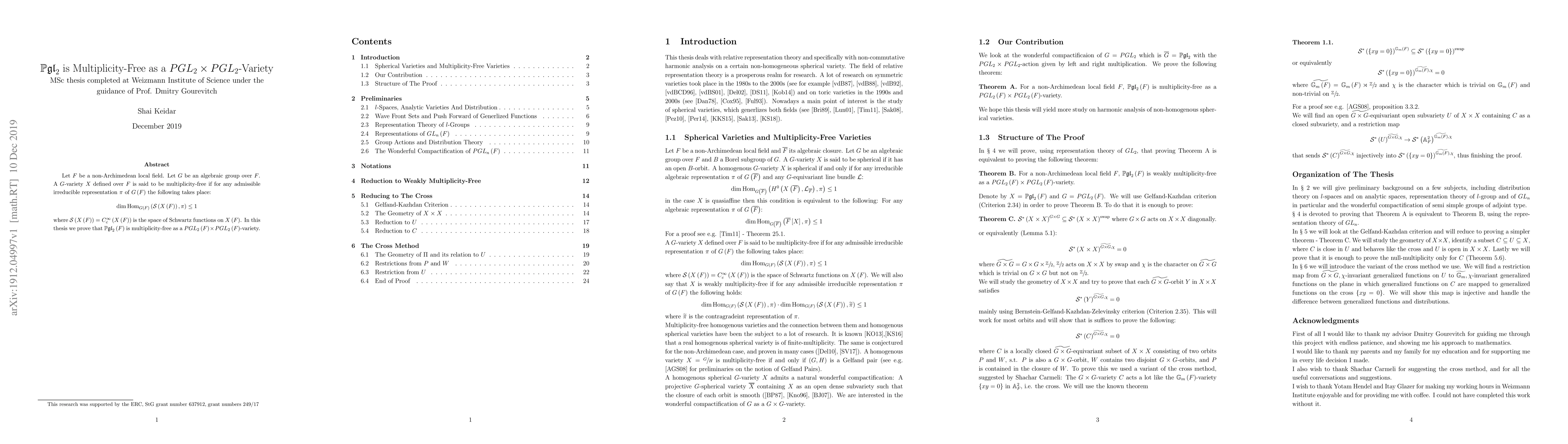 Let $F$ be a non-Archimedean local field. Let $G$ be an algebraic group over $F$. A $G$-variety $X$ defined over $F$ is said to be multiplicity-free if for any admissible irreducible representation $\pi$ of $G(F)$ the following takes place: $\dim Hom_{G(F)}(\mathcal{S}(X(F)), \pi) \le 1$ where $\mathcal{S}(X(F))$ is the space of Schwartz functions on $X(F)$. In this thesis we prove that $\mathbb{P}\mathfrak{gl}_{2}(F)$ is multiplicity-free as a $PGL_{2}(F)\times PGL_{2}(F)$-variety.