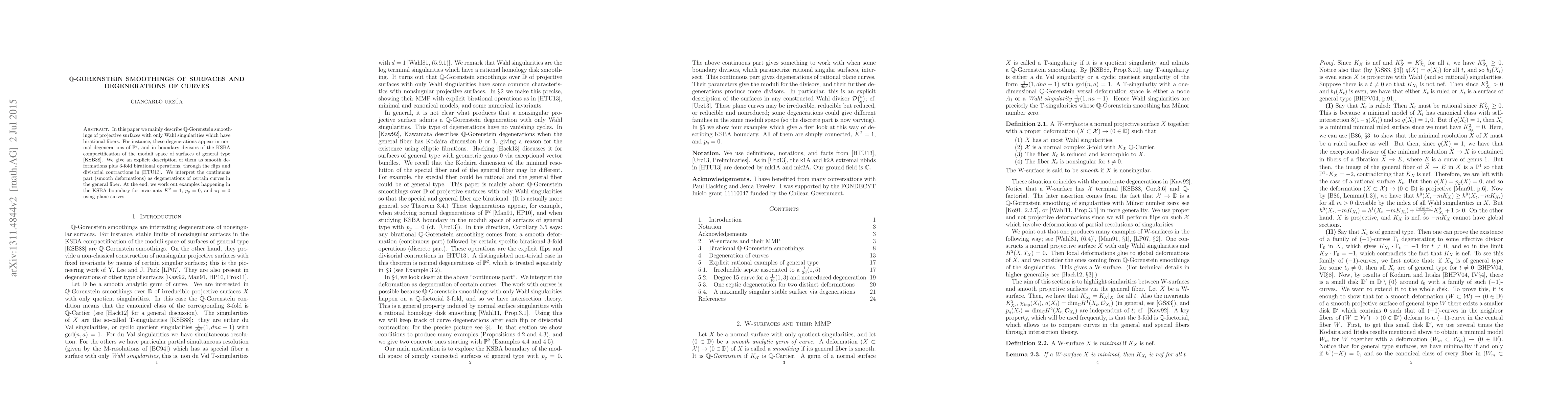 In this paper we mainly describe $\mathbb{Q}$-Gorenstein smoothings of projective surfaces with only Wahl singularities which have birational fibers. For instance, these degenerations appear in normal degenerations of the projective plane, and in boundary divisors of the KSBA compactification of the moduli space of surfaces of general type [KSB88]. We give an explicit description of them as smooth deformations plus 3-fold birational operations, through the flips and divisorial contractions in [HTU13]. We interpret the continuous part (smooth deformations) as degenerations of certain curves in the general fiber. At the end, we work out examples happening in the KSBA boundary for invariants $K^2=1$, $p_g=0$, and $\pi_1=0$ using plane curves.