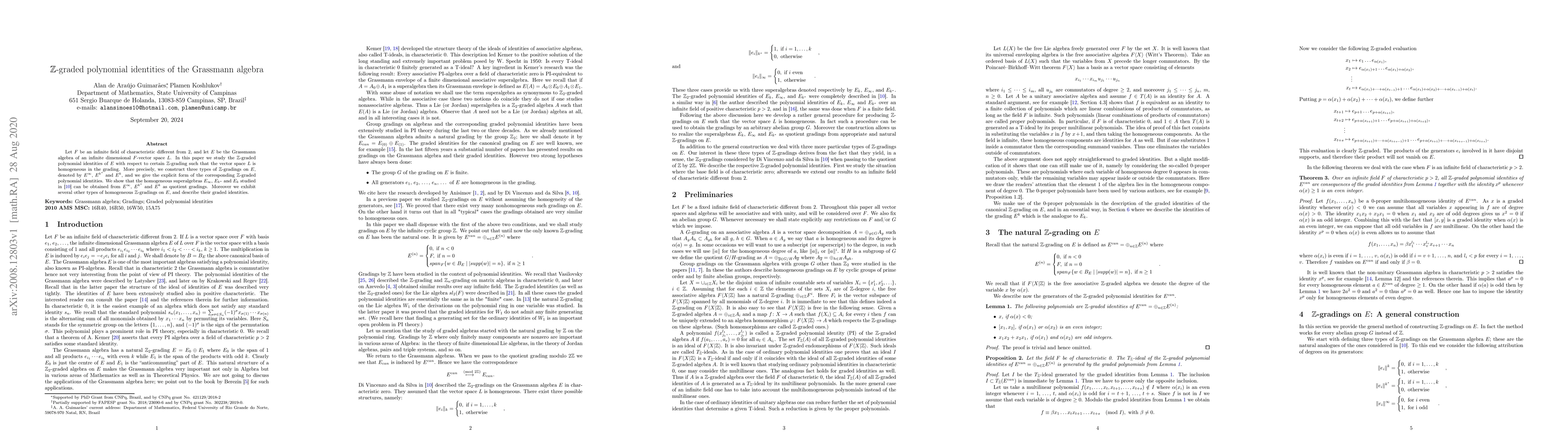 This paper investigates $\mathbb{Z}$-graded polynomial identities in the Grassmann algebra $E$ over an infinite field $F$ of characteristic not 2. It constructs three specific $\mathbb{Z}$-gradings on $E$ and explicitly provides their graded polynomial identities, demonstrating connections to previously studied homogeneous superalgebras.