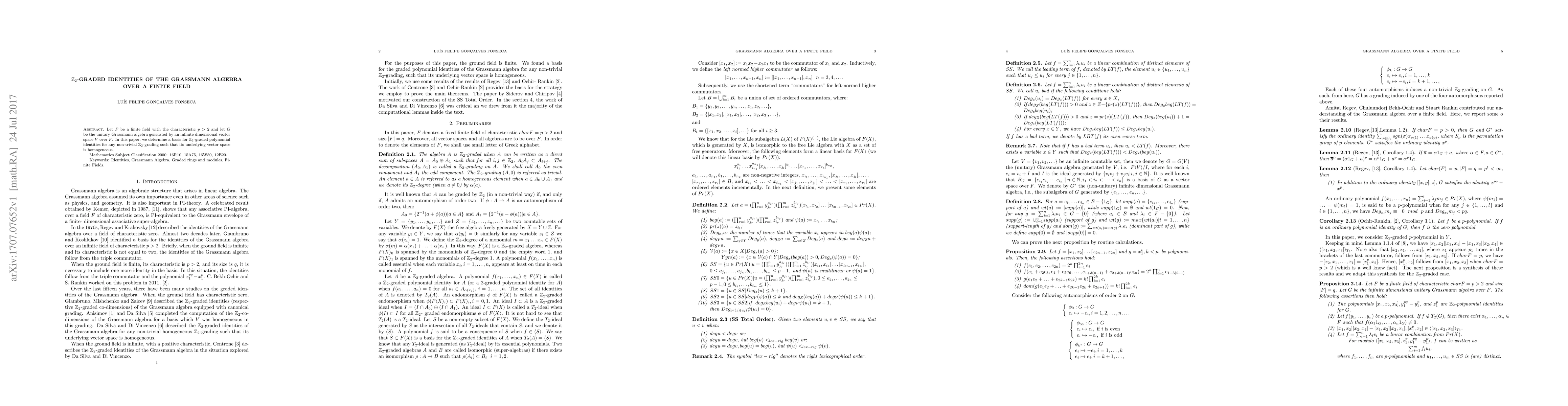 This paper determines a basis for ‒graded polynomial identities for the Grassmann algebra over a finite field with characteristic p > 2. It focuses on non-trivial ‒grading that results in homogeneous underlying vector spaces.