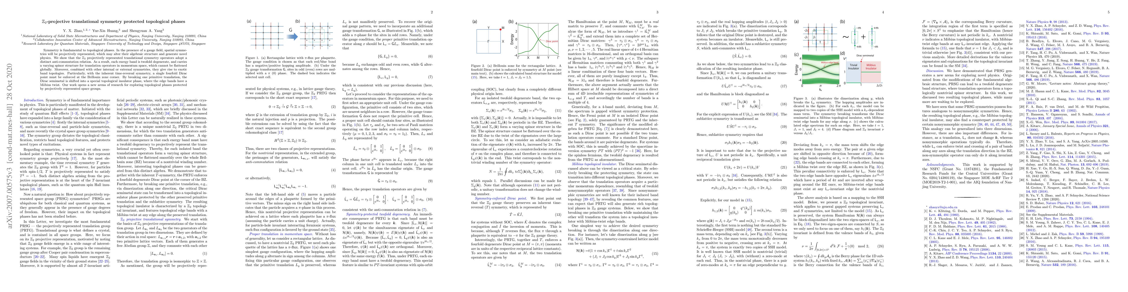 This paper explores topological phases protected by $\mathbb{Z}_2$ projectively represented translational symmetry in the presence of a gauge field, leading to novel band topologies including unique degeneracies and Dirac points. The study reveals that breaking a primitive translation can transition the system into a topological insulator phase with Möbius twist edge bands.