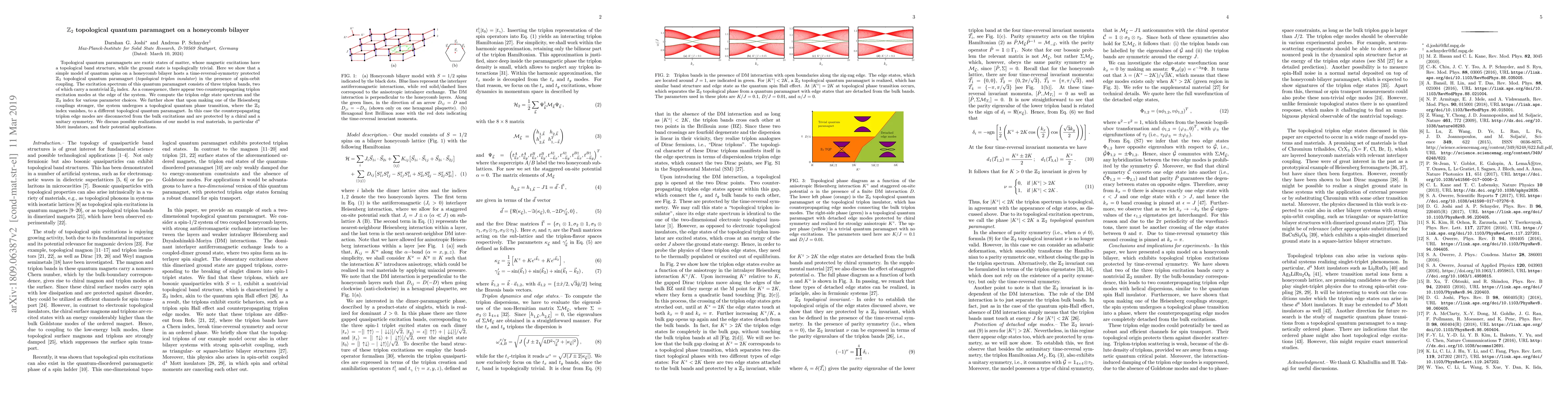 Topological quantum paramagnets are exotic states of matter, whose magnetic excitations have a topological band structure, while the ground state is topologically trivial. Here we show that a simple model of quantum spins on a honeycomb bilayer hosts a time-reversal-symmetry protected $\mathbb{Z}_2$ topological quantum paramagnet ({\em topological triplon insulator}) in the presence of spin-orbit coupling. The excitation spectrum of this quantum paramagnet consists of three triplon bands, two of which carry a nontrivial $\mathbb{Z}_2$ index. As a consequence, there appear two counterpropagating triplon excitation modes at the edge of the system. We compute the triplon edge state spectrum and the $\mathbb{Z}_2$ index for various parameter choices. We further show that upon making one of the Heisenberg couplings stronger, the system undergoes a topological quantum phase transition, where the $\mathbb{Z}_2$ index vanishes, to a different topological quantum paramagnet. In this case the counterpopagating triplon edge modes are disconnected from the bulk excitations and are protected by a chiral and a unitary symmetry. We discuss possible realizations of our model in real materials, in particular d$^{4}$ Mott insulators, and their potential applications.