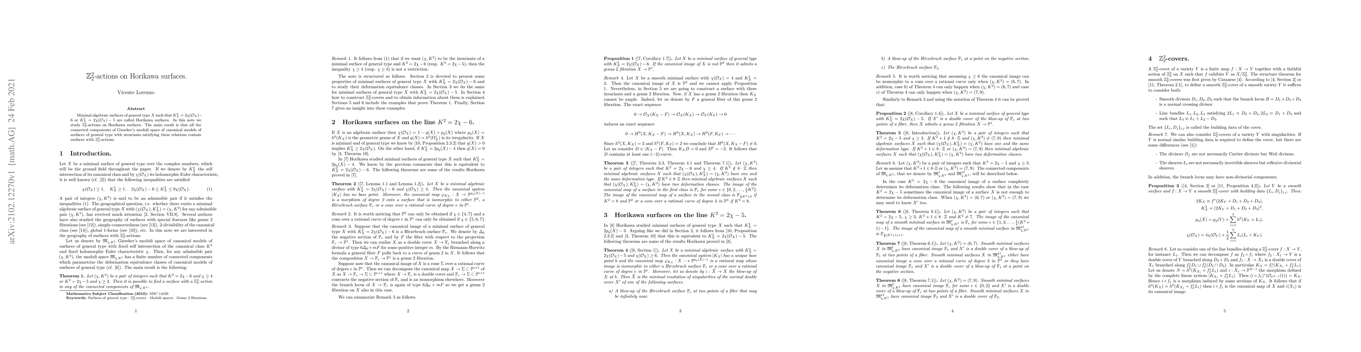 Minimal algebraic surfaces of general type $X$ such that $K^2_X=2\chi(\mathcal{O}_X)-6$ or $K^2_X=2\chi(\mathcal{O}_X)-5$ are called Horikawa surfaces. In this note we study $\mathbb{Z}^2_2$-actions on Horikawa surfaces. The main result is that all the connected components of Gieseker's moduli space of canonical models of surfaces of general type with invariants satisfying these relations contain surfaces with $\mathbb{Z}^2_2$-actions.