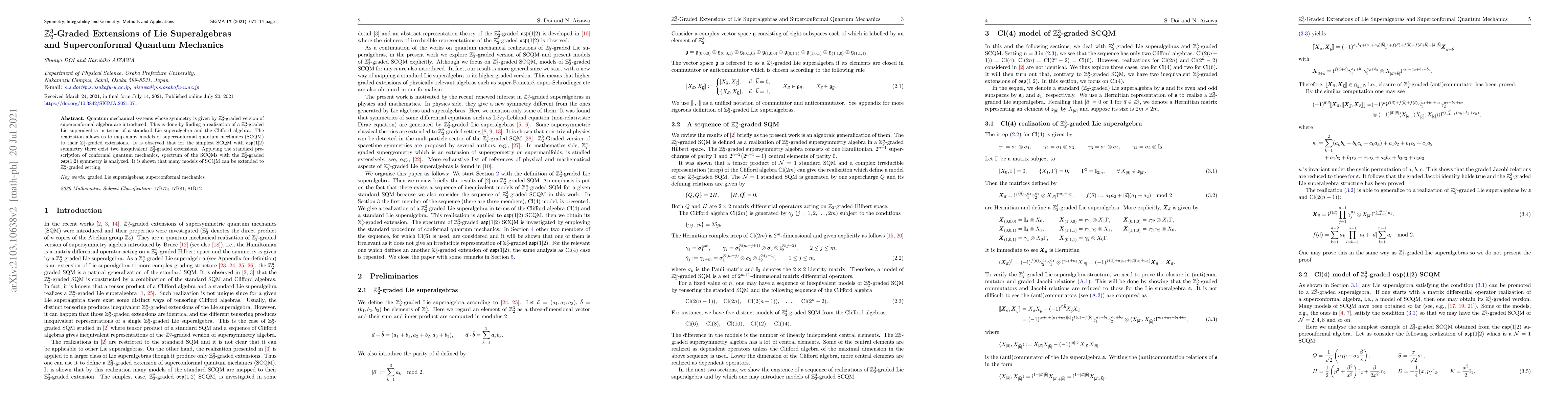 This paper introduces quantum mechanical systems based on $\mathbb{Z}_2^3$-graded superconformal algebras, realizing a $\mathbb{Z}_2^3$-graded Lie superalgebra using a standard Lie superalgebra and the Clifford algebra. It demonstrates two inequivalent $\mathbb{Z}_2^3$-graded extensions for the simplest superconformal quantum mechanics model and explores their spectrum.