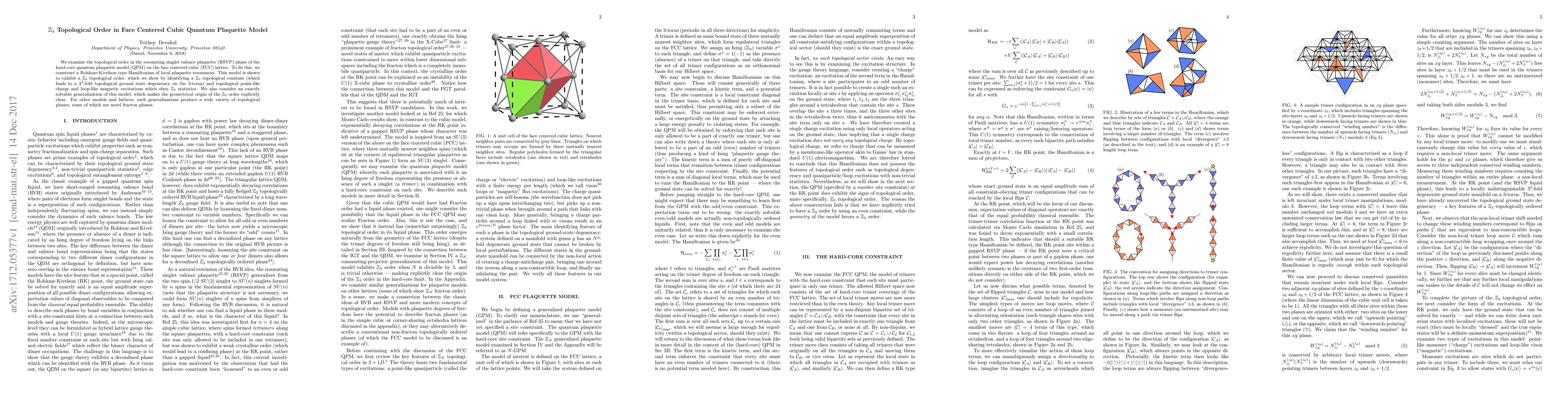 We examine the topological order in the resonating singlet valence plaquette (RSVP) phase of the hard-core quantum plaquette model (QPM) on the face centered cubic (FCC) lattice. To do this, we construct a Rohksar-Kivelson type Hamiltonian of local plaquette resonances. This model is shown to exhibit a $\mathbb{Z}_3$ topological order, which we show by identifying a $\mathbb{Z}_3$ topological constant (which leads to a $3^3$-fold topological ground state degeneracy on the $3$-torus) and topological point-like charge and loop-like magnetic excitations which obey $\mathbb{Z}_3$ statistics. We also consider an exactly solvable generalization of this model, which makes the geometrical origin of the $\mathbb{Z}_3$ order explicitly clear. For other models and lattices, such generalizations produce a wide variety of topological phases, some of which are novel fracton phases.