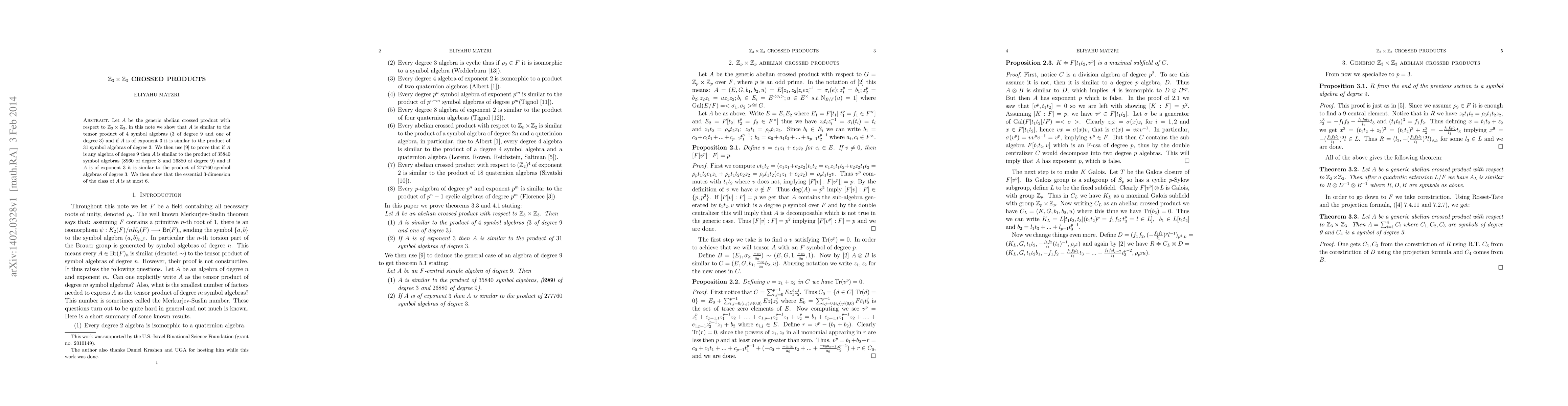 Let $A$ be the generic abelian crossed product with respect to $\mathbb{Z}_3\times \mathbb{Z}_3$, in this note we show that $A$ is similar to the tensor product of 4 symbol algebras (3 of degree 9 and one of degree 3) and if $A$ is of exponent $3$ it is similar to the product of 31 symbol algebras of degree $3$. We then use \cite{RS} to prove that if $A$ is any algebra of degree $9$ then $A$ is similar to the product of $35840$ symbol algebras ($8960$ of degree $3$ and $26880$ of degree $9$) and if $A$ is of exponent $3$ it is similar to the product of $277760$ symbol algebras of degree $3$. We then show that the essential $3$-dimension of the class of $A$ is at most $6$.