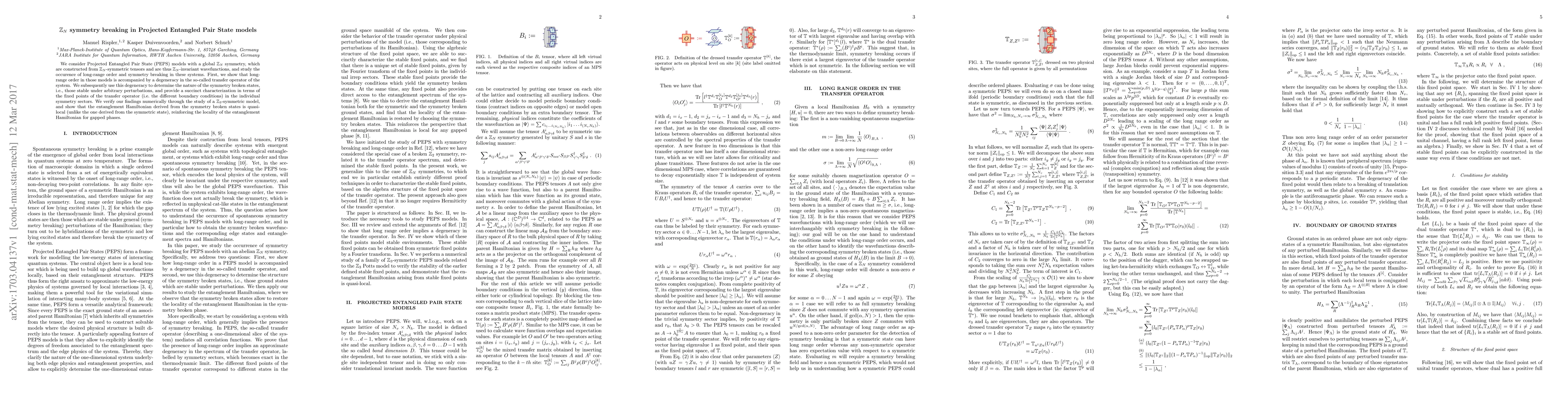 This paper investigates Projected Entangled Pair State (PEPS) models with $\mathbb{Z}_N$ symmetry, demonstrating that long-range order is linked to degeneracy in the transfer operator. It characterizes symmetry broken states through fixed points of the transfer operator, verified numerically for a $\mathbb{Z}_3$ model, showing that the entanglement Hamiltonian for symmetry broken states is quasi-local.