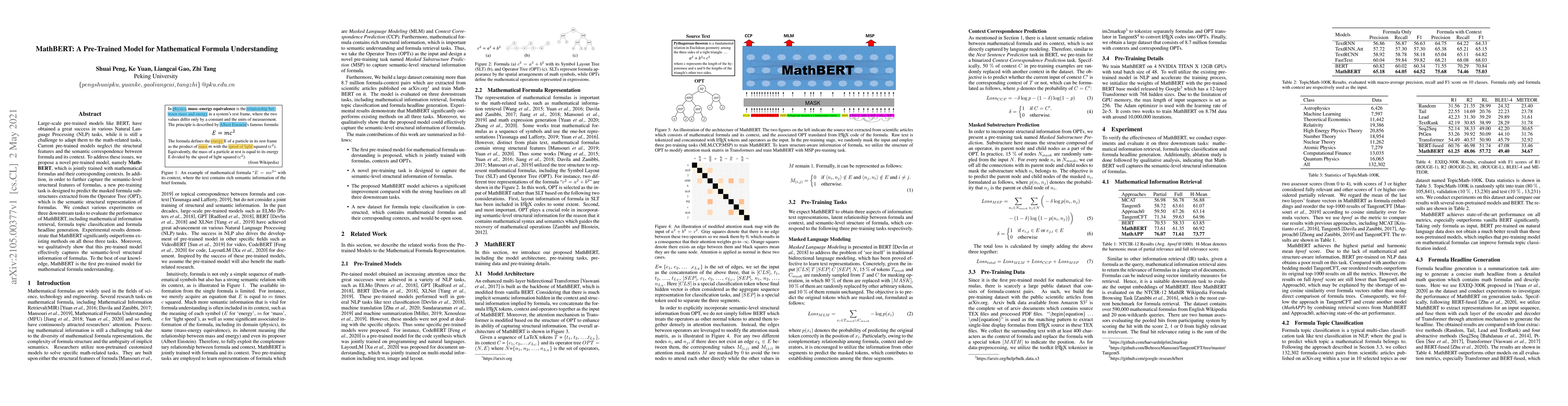 MathBERT is a pre-trained model for mathematical formula understanding, jointly trained with formulas, contexts, and their corresponding Operator Trees (OPTs). It introduces a novel pre-training task, Masked Substructure Prediction (MSP), to capture semantic-level structural information of formulas. The model is trained on a large dataset of over 8.7 million formula-context pairs extracted from scientific articles on arXiv.org.