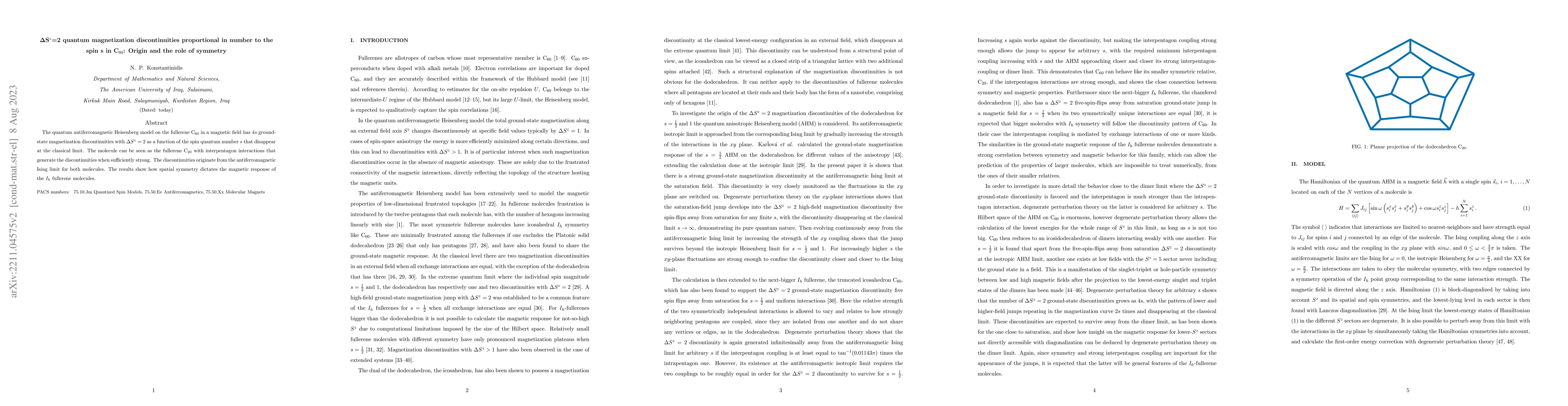The quantum antiferromagnetic Heisenberg model on the fullerene C$_{60}$ in a magnetic field has $4s$ ground-state magnetization discontinuities with $\Delta S^z=2$ as a function of the spin quantum number $s$ that disappear at the classical limit. The molecule can be seen as the fullerene C$_{20}$ with interpentagon interactions that generate the discontinuities when sufficiently strong. The discontinuities originate from the antiferromagnetic Ising limit for both molecules. The results show how spatial symmetry dictates the magnetic response of the $I_h$ fullerene molecules.