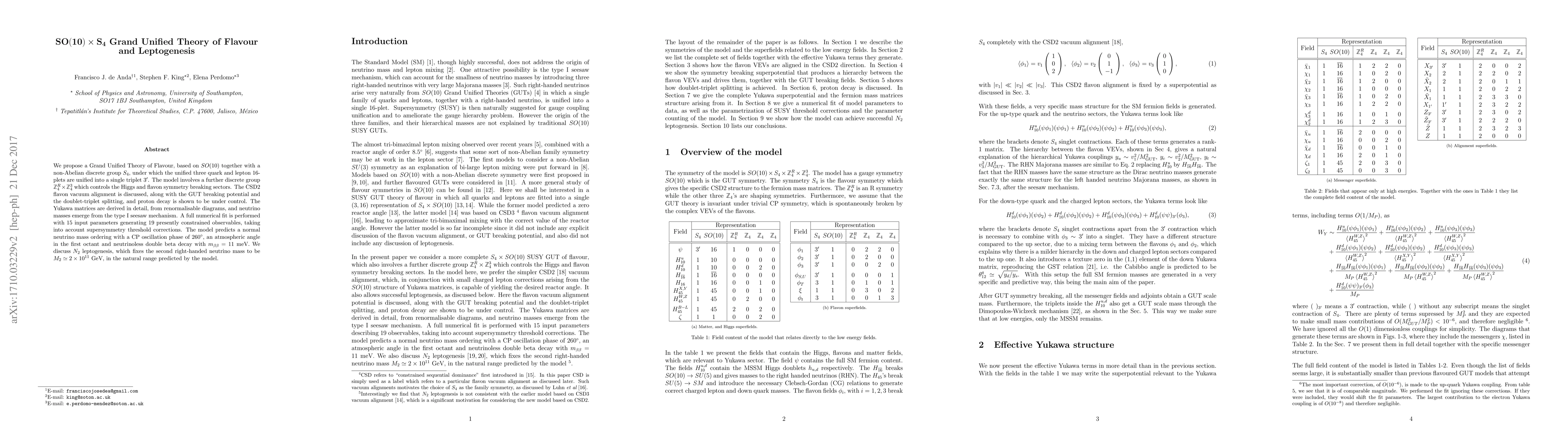 This paper proposes a Grand Unified Theory of Flavour based on $SO(10) \times S_4$, incorporating discrete symmetries to control Yukawa matrices and neutrino masses via the type I seesaw mechanism. The model predicts a normal neutrino mass ordering, a CP phase of $260^{\circ}$, and $N_2$ leptogenesis with $M_2 \simeq 2 \times 10^{11}$ GeV.