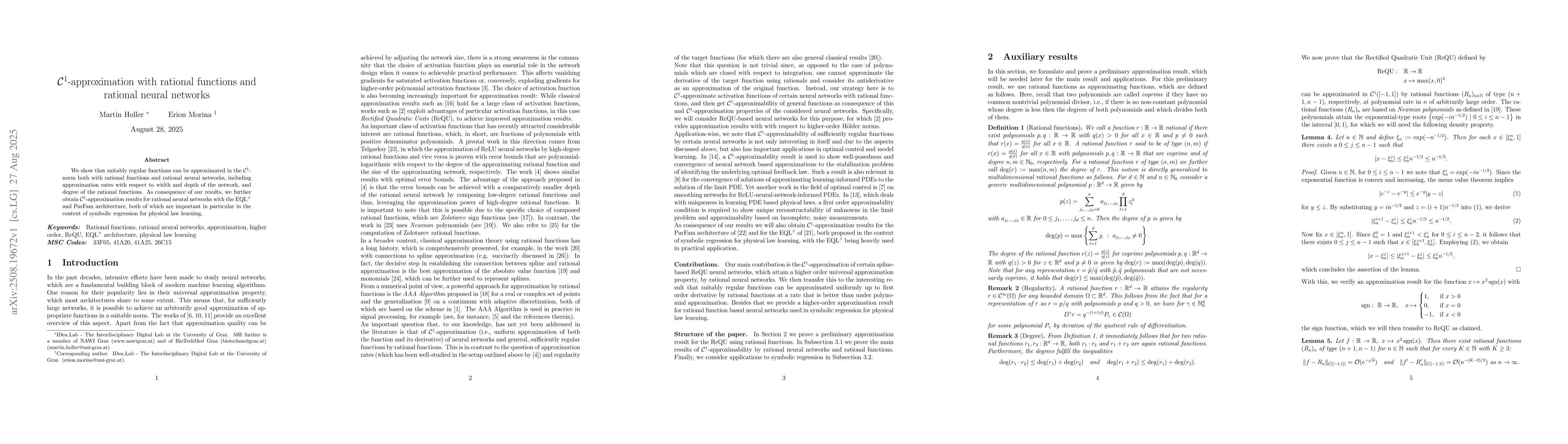 We show that suitably regular functions can be approximated in the $\mathcal{C}^1$-norm both with rational functions and rational neural networks, including approximation rates with respect to width and depth of the network, and degree of the rational functions. As consequence of our results, we further obtain $\mathcal{C}^1$-approximation results for rational neural networks with the $\text{EQL}^\div$ and ParFam architecture, both of which are important in particular in the context of symbolic regression for physical law learning.