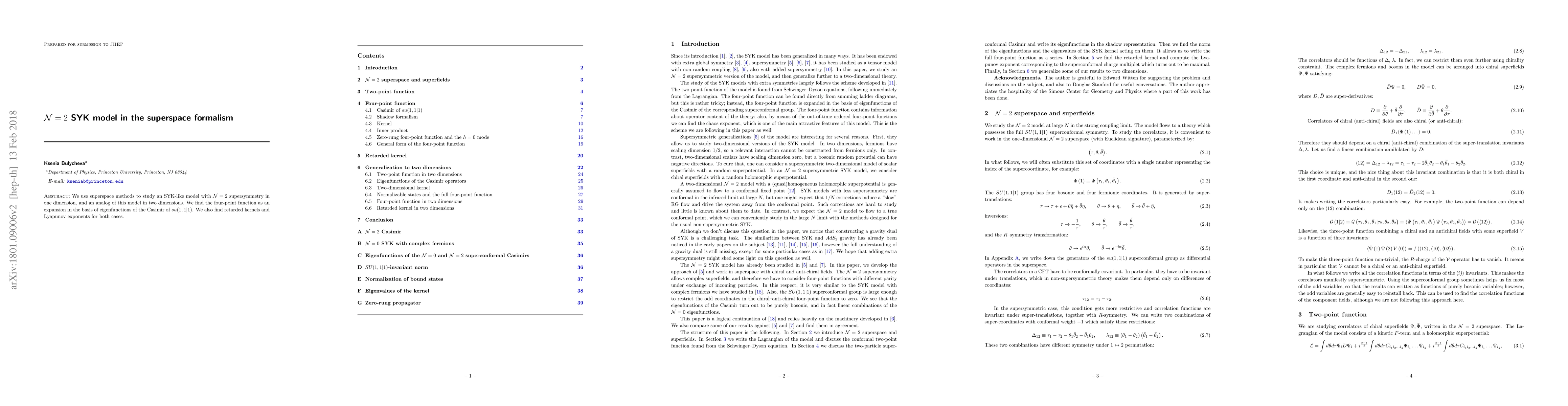 Researchers studied a supersymmetric version of the SYK model in 1D and 2D using superspace methods, finding its four-point function and other properties.