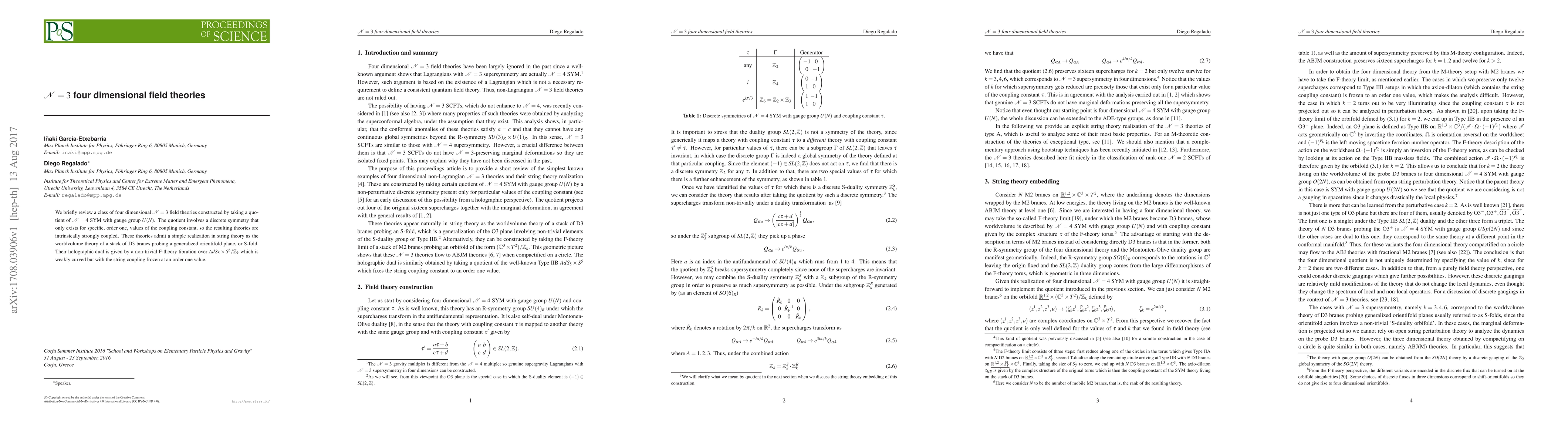 This paper reviews $\mathcal N=3$ four-dimensional field theories derived from $\mathcal N=4$ SYM with $U(N)$ gauge group, involving a specific discrete symmetry for strong coupling. Their string theory realization is as D3 branes probing a generalized orientifold plane, with a holographic dual in F-theory over $AdS_5 \times S^5/\mathbb Z_k$.