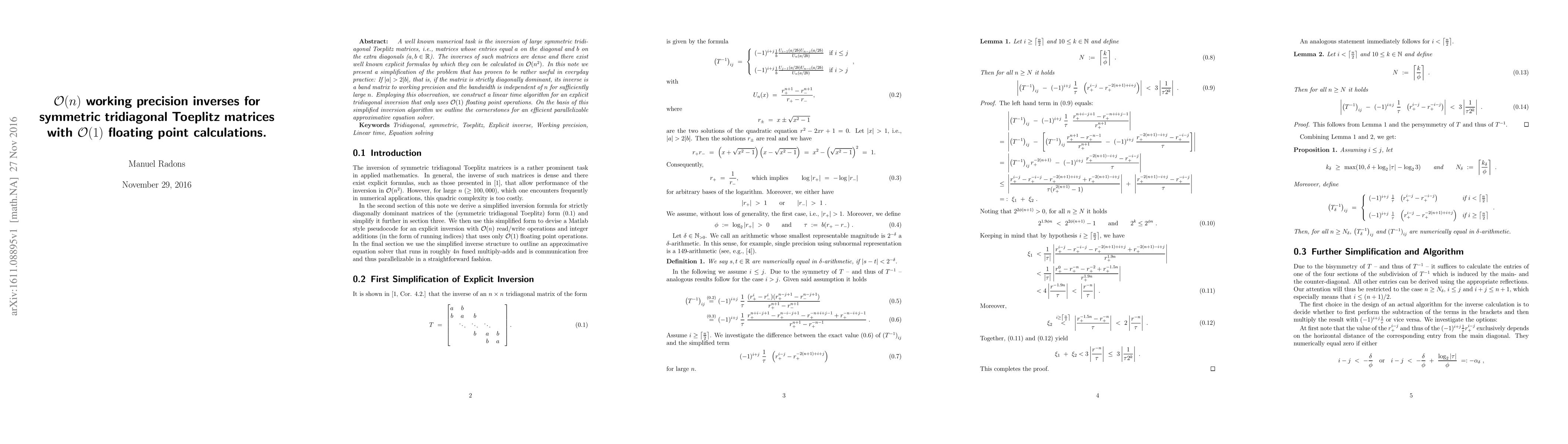 A well known numerical task is the inversion of large symmetric tridiagonal Toeplitz matrices, i.e., matrices whose entries equal $a$ on the diagonal and $b$ on the extra diagonals ($a, b\in \mathbb R$). The inverses of such matrices are dense and there exist well known explicit formulas by which they can be calculated in $\mathcal O(n^2)$. In this note we present a simplification of the problem that has proven to be rather useful in everyday practice: If $\vert a\vert > 2\vert b\vert$, that is, if the matrix is strictly diagonally dominant, its inverse is a band matrix to working precision and the bandwidth is independent of $n$ for sufficiently large $n$. Employing this observation, we construct a linear time algorithm for an explicit tridiagonal inversion that only uses $\mathcal O(1)$ floating point operations. On the basis of this simplified inversion algorithm we outline the cornerstones for an efficient parallelizable approximative equation solver.