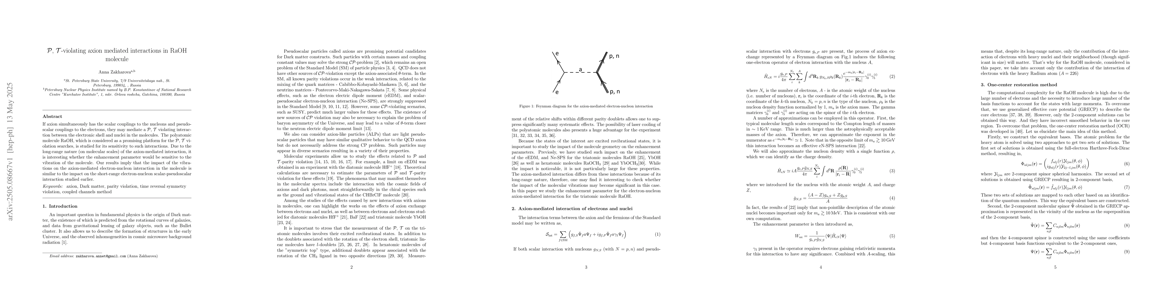 The paper presents a theoretical framework for P, T-violating axion-mediated interactions in RaOH, linking nucleon-axion and electron-axion couplings to molecular vibrational sensitivity.