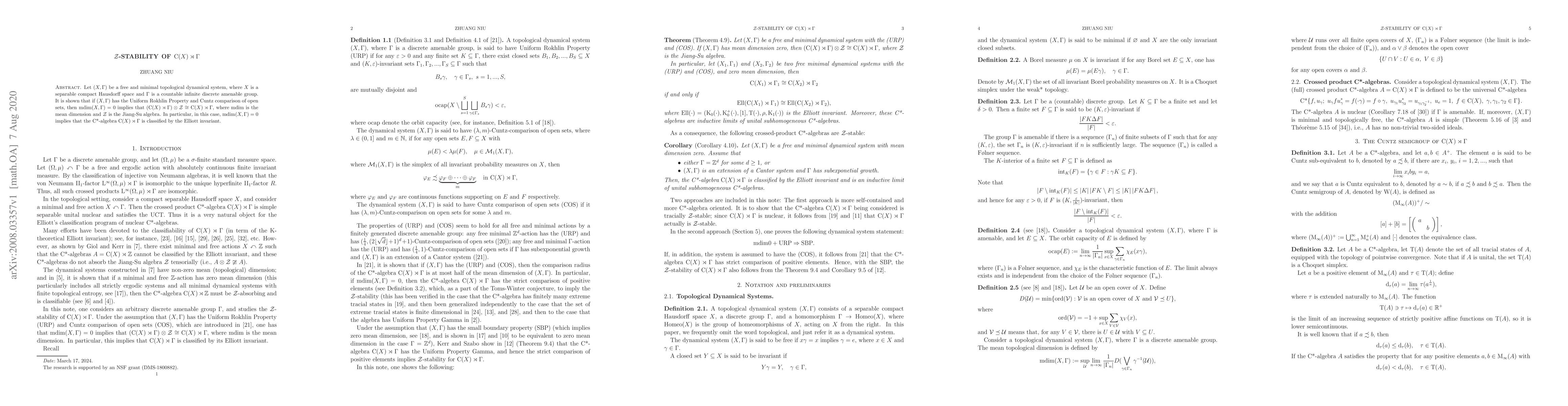 This paper demonstrates that for a free and minimal topological dynamical system $(X, \Gamma)$ with the Uniform Rokhlin Property and Cuntz comparison, $\mathrm{C}(X)\rtimes\Gamma\otimes\mathcal Z \cong \mathrm{C}(X) \rtimes\Gamma$ when $\mathrm{mdim}(X, \Gamma)=0$. This implies the C*-algebra $\mathrm{C}(X)\rtimes\Gamma$ is classified by the Elliott invariant.
