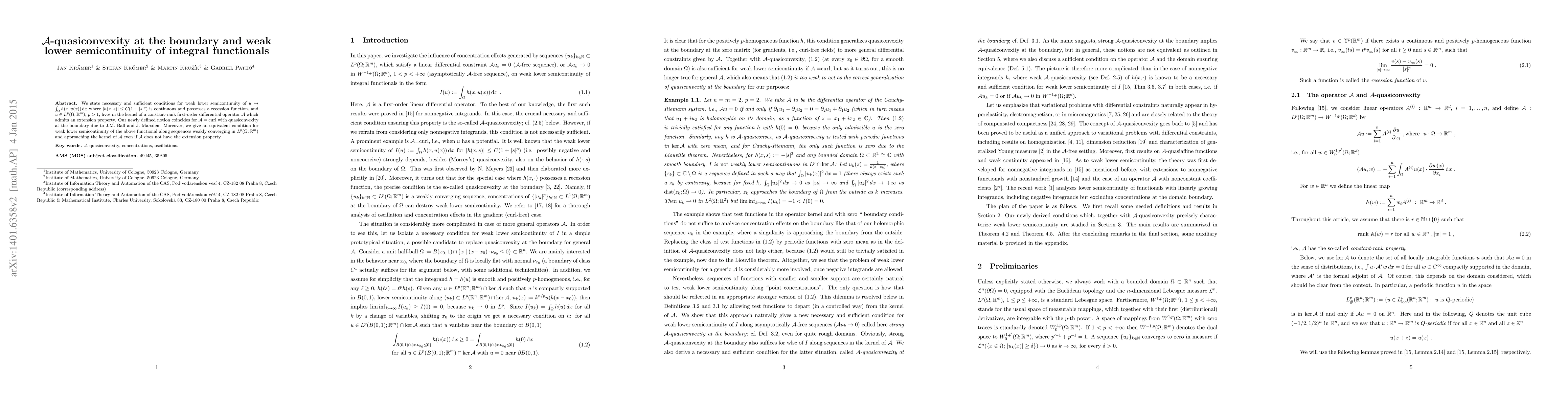 We state necessary and sufficient conditions for weak lower semicontinuity of $u\mapsto\int_\Omega h(x,u(x))\,d x$ where $|h(x,s)|\le C(1+|s|^p)$ is continuous and possesses a recession function, and $u\in L^p(\Omega;\mathbb{R}^m)$, $p>1$, lives in the kernel of a constant-rank first-order differential operator $\mathcal{A}$ which admits an extension property. Our newly defined notion coincides for $\mathcal{A}=\operatorname{curl}$ with quasiconvexity at the boundary due to J.M. Ball and J. Marsden. Moreover, we give an equivalent condition for weak lower semicontinuity of the above functional along sequences weakly converging in $L^p(\Omega;\mathbb{R}^m)$ and approaching the kernel of $\mathcal{A}$ even if $\mathcal{A}$ does not have the extension property.