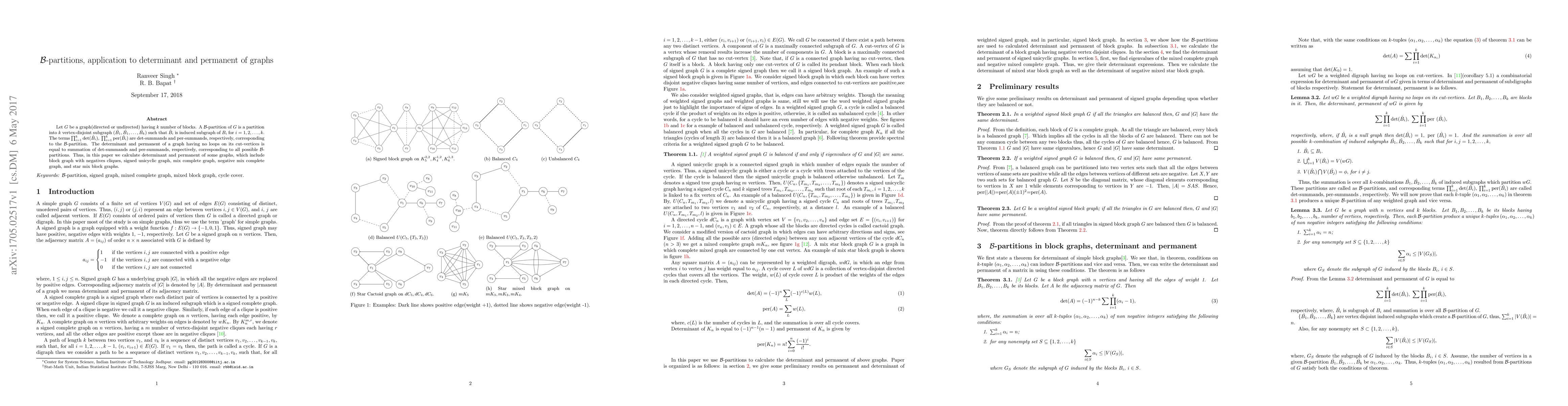 This paper explores $\mathcal{B}$-partitions of graphs to compute their determinants and permanents. It establishes that the determinant and permanent of a graph can be expressed as sums of det-summands and per-summands derived from all possible $\mathcal{B}$-partitions. The study applies this method to various graph types, including block graphs with negative cliques and star mix block graphs.