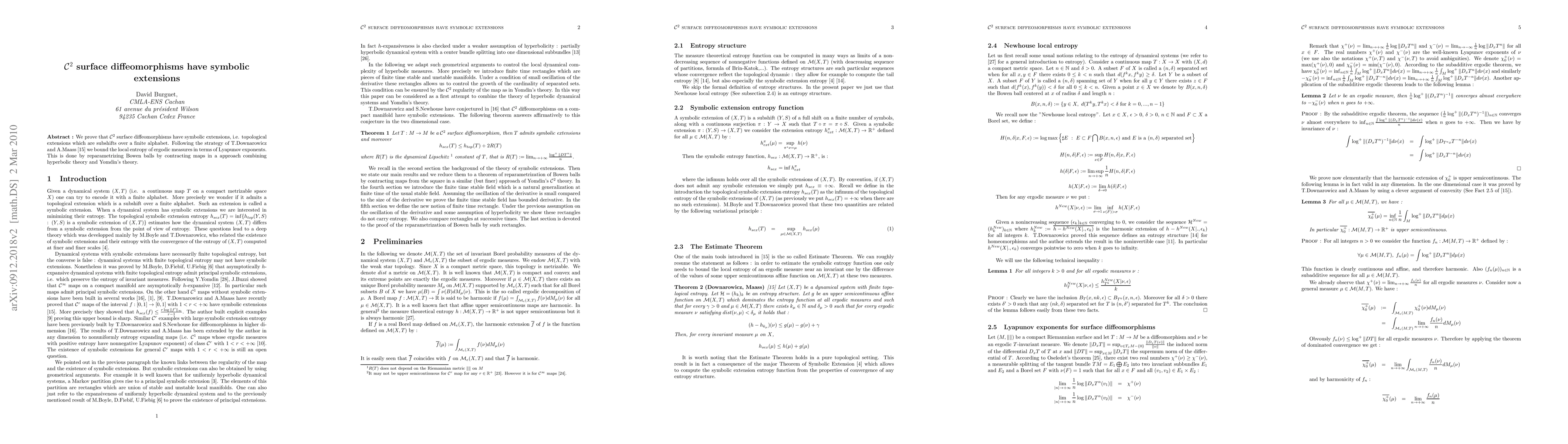 This paper proves that $\mathcal{C}^2$ surface diffeomorphisms possess symbolic extensions, specifically topological extensions that are subshifts over a finite alphabet. The authors achieve this by bounding the local entropy of ergodic measures using Lyapunov exponents, employing a method that merges hyperbolic theory and Yomdin's theory.
