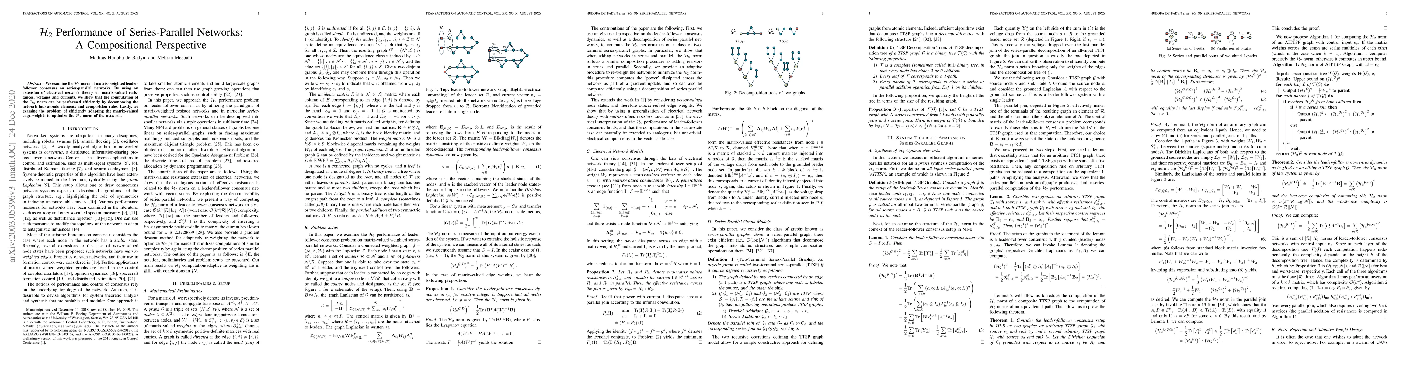 We examine the $\mathcal{H}_2$ norm of matrix-weighted leader-follower consensus on series-parallel networks. By using an extension of electrical network theory on matrix-valued resistances, voltages and currents, we show that the computation of the $\mathcal{H}_2$ norm can be performed efficiently by decomposing the network into atomic elements and composition rules. Lastly, we examine the problem of efficiently adapting the matrix-valued edge weights to optimize the $\mathcal{H}_2$ norm of the network.