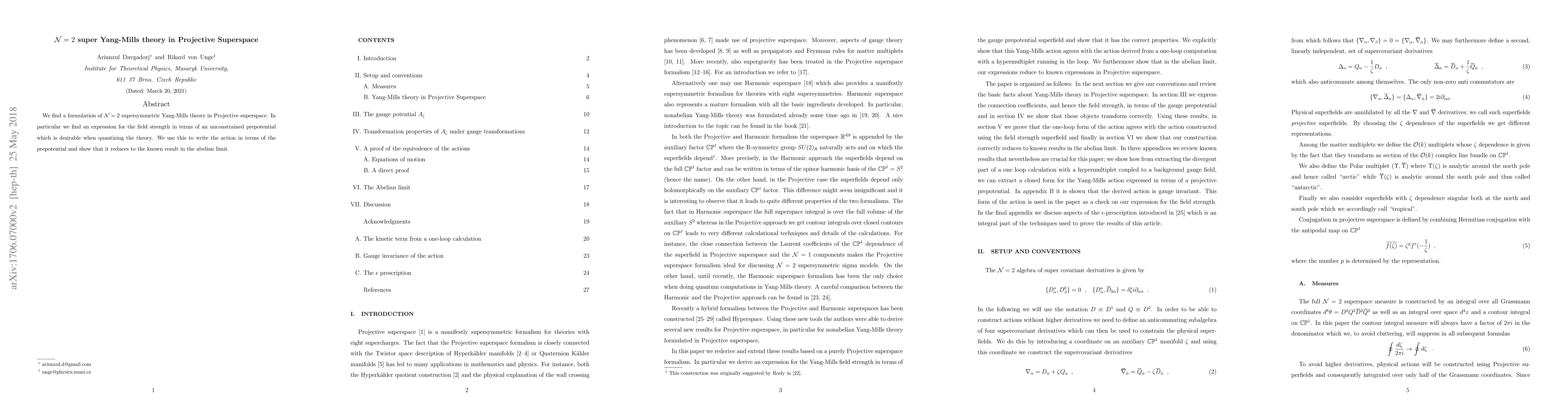 This paper formulates $\mathcal{N}=2$ supersymmetric Yang-Mills theory in projective superspace, deriving an expression for the field strength using an unconstrained prepotential. The action is expressed in terms of this prepotential, simplifying quantization and reducing to the abelian limit as expected.