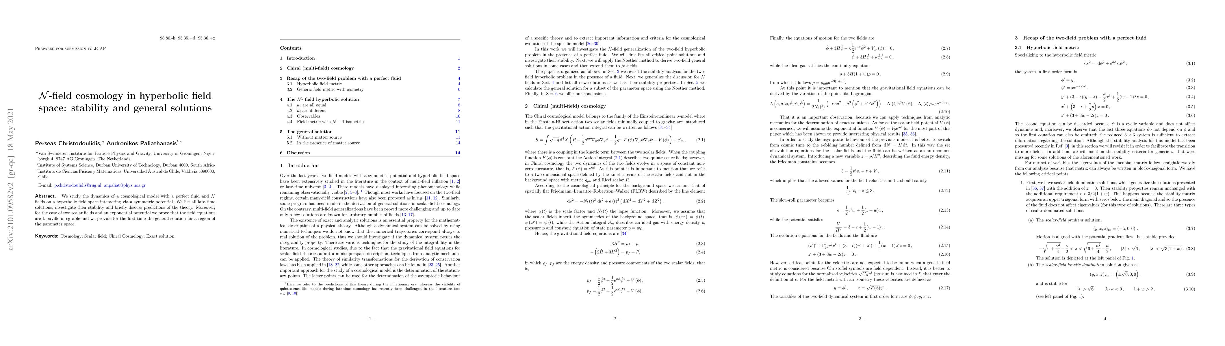We study the dynamics of a cosmological model with a perfect fluid and $\mathcal{N}$ fields on a hyperbolic field space interacting via a symmetric potential. We list all late-time solutions, investigate their stability and briefly discuss predictions of the theory. Moreover, for the case of two scalar fields and an exponential potential we prove that the field equations are Liouville integrable and we provide for the first time the general solution for a region of the parameter space.