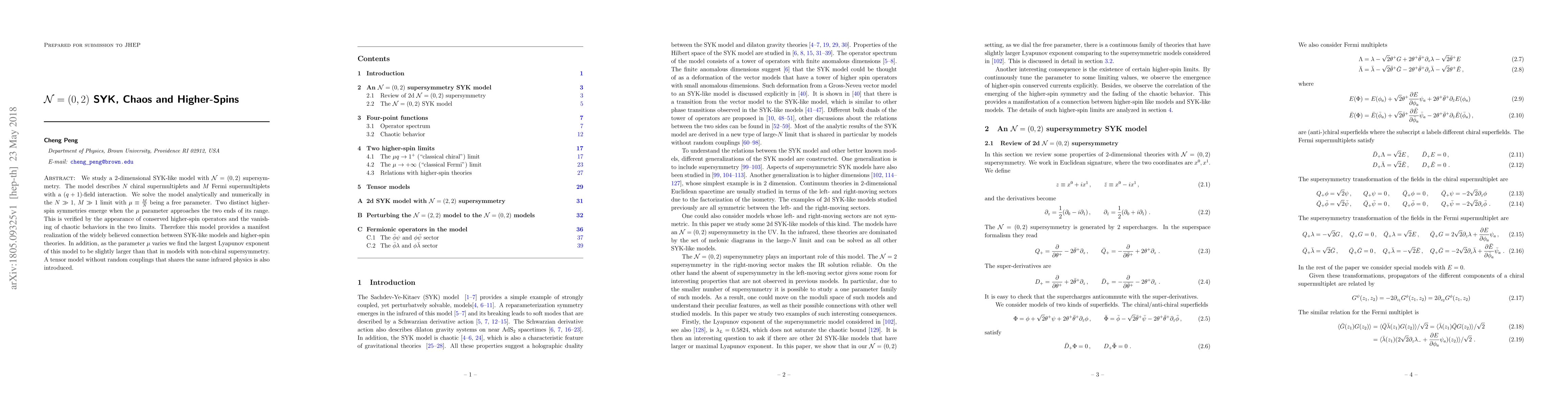 We study a 2-dimensional SYK model with $\mathcal{N}=(0,2)$ supersymmetry. The model describes $N$ chiral supermultiplets and $M$ Fermi supermultiplets with a $(q+1)$-field interaction. We solve the model analytically and numerically in the $N\gg 1$, $M\gg 1$ limit with $\mu\equiv \frac{M}{N}$ being a free parameter. Two distinct higher-spin symmetries emerge when the $\mu$ parameter approaches the two ends of its range. This is verified by the appearance of conserved higher-spin operators and the vanishing of chaotic behaviors in the two limits. Therefore this model provides a manifest realization of the widely believed connection between SYK-like models and higher-spin theories. In addition, as the parameter $\mu$ varies we find the largest Lyapunov exponent of this model to be slightly larger than that in models with non-chiral supersymmetry. A tensor model without random couplings that shares the same infrared physics is also introduced.