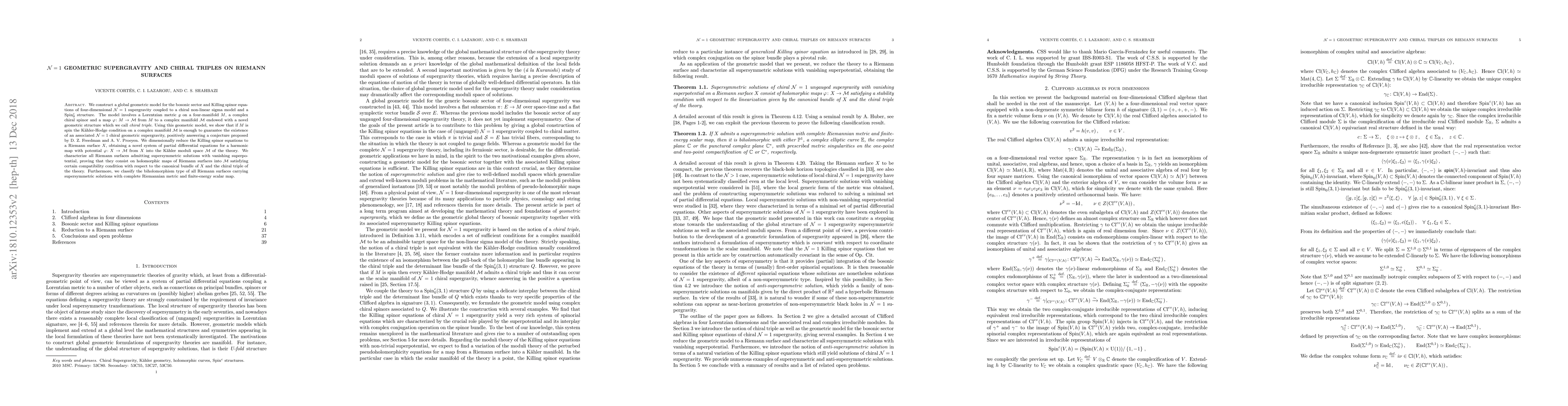 We construct a global geometric model for the bosonic sector and Killing spinor equations of four-dimensional $\mathcal{N}=1$ supergravity coupled to a chiral non-linear sigma model and a Spin$^{c}_0$ structure. The model involves a Lorentzian metric $g$ on a four-manifold $M$, a complex chiral spinor and a map $\varphi\colon M\to \mathcal{M}$ from $M$ to a complex manifold $\mathcal{M}$ endowed with a novel geometric structure which we call chiral triple. Using this geometric model, we show that if $M$ is spin the K\"ahler-Hodge condition on a complex manifold $\mathcal{M}$ is enough to guarantee the existence of an associated $\mathcal{N}=1$ chiral geometric supergravity, positively answering a conjecture proposed by D. Z. Freedman and A. V. Proeyen. We dimensionally reduce the Killing spinor equations to a Riemann surface $X$, obtaining a novel system of partial differential equations for a harmonic map with potential $\varphi\colon X\to \mathcal{M}$ from $X$ into the K\"ahler moduli space $\mathcal{M}$ of the theory. We characterize all Riemann surfaces admitting supersymmetric solutions with vanishing superpotential, proving that they consist on holomorphic maps of Riemann surfaces into $\mathcal{M}$ satisfying certain compatibility condition with respect to the canonical bundle of $X$ and the chiral triple of the theory. Furthermore, we classify the biholomorphism type of all Riemann surfaces carrying supersymmetric solutions with complete Riemannian metric and finite-energy scalar map.