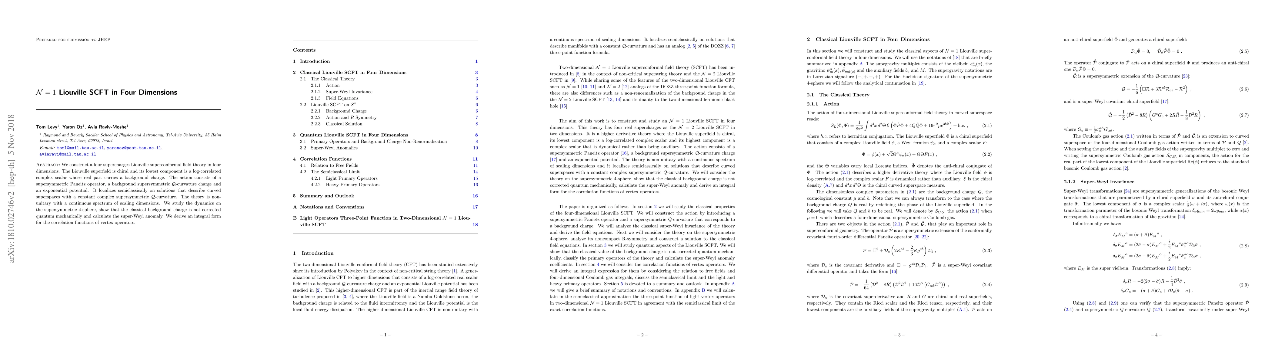 This research constructs a four-dimensional superconformal field theory (SCFT) with N=1 supersymmetry, based on Liouville action. The theory involves a chiral Liouville superfield with a log-correlated complex scalar, and its action includes a supersymmetric Paneitz operator, a background supersymmetric Q-curvature charge, and an exponential potential. The theory localizes on solutions with constant complex supersymmetric Q-curvature and is non-unitary with a continuous spectrum. The study examines the dynamics on the supersymmetric 4-sphere, showing the background charge remains uncorrected quantum mechanically, and derives an integral form for vertex operator correlation functions.