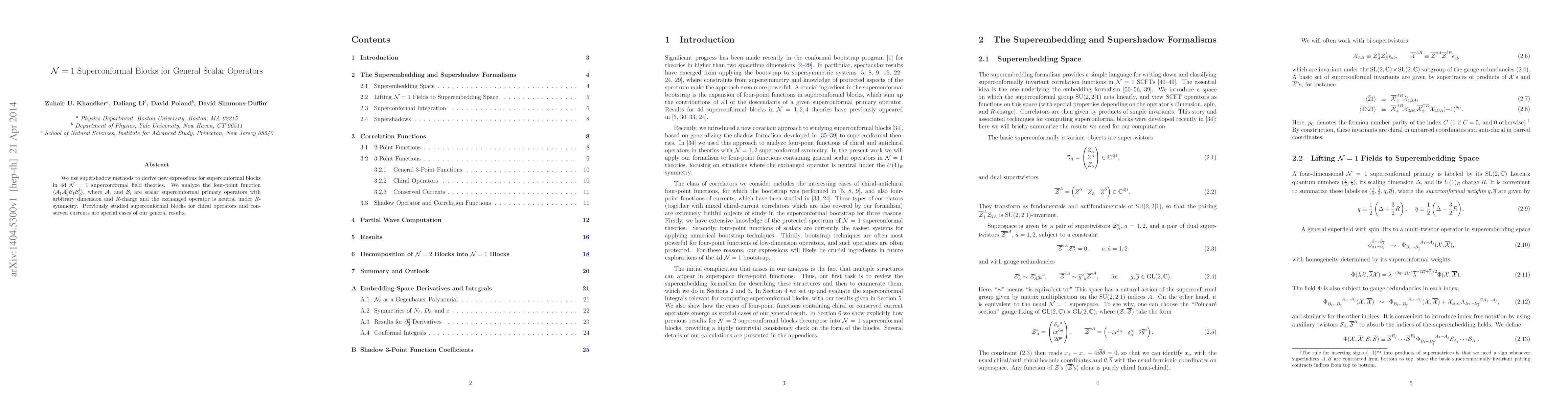 We use supershadow methods to derive new expressions for superconformal blocks in 4d $\mathcal{N}=1$ superconformal field theories. We analyze the four-point function $\langle\mathcal{A}_1 \mathcal{A}_2^\dagger \mathcal{B}_1 \mathcal{B}_2^\dagger\rangle$, where $\mathcal{A}_i$ and $\mathcal{B}_i$ are scalar superconformal primary operators with arbitrary dimension and $R$-charge and the exchanged operator is neutral under $R$-symmetry. Previously studied superconformal blocks for chiral operators and conserved currents are special cases of our general results.