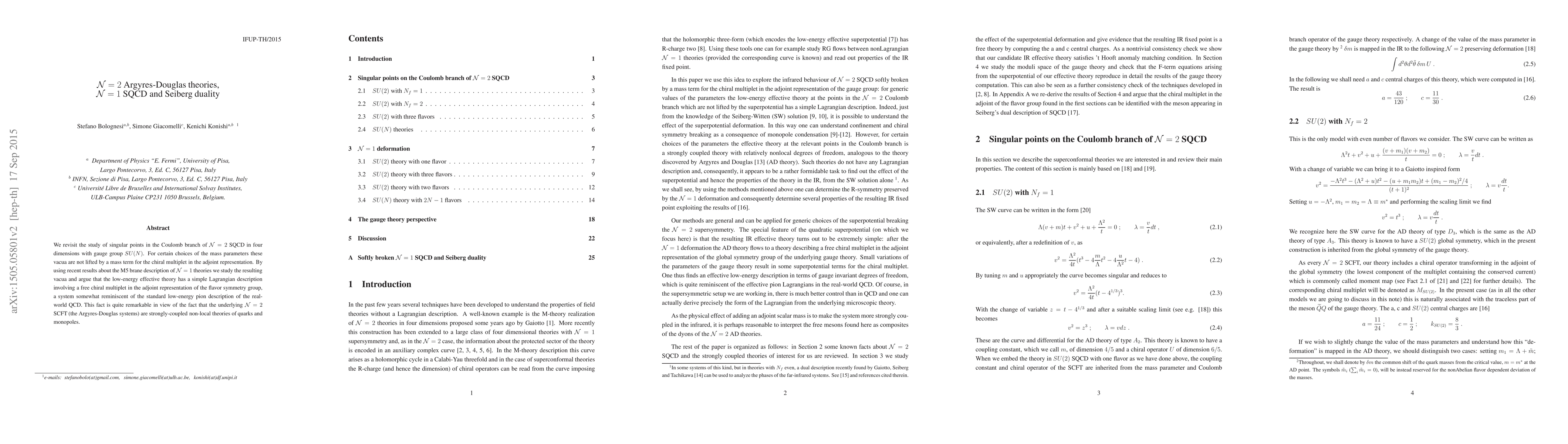 We revisit the study of singular points in the Coulomb branch of $\mathcal{N}=2$ SQCD in four dimensions with gauge group $SU(N)$ and odd number of flavors. For certain choices of the mass parameters these vacua are not lifted by a mass term for the chiral multiplet in the adjoint representation. By using recent results about the M5 brane description of $\mathcal{N}=1$ theories we study the resulting vacua and argue that the low-energy effective theory has a simple Lagrangian description involving a free chiral multiplet in the adjoint representation of the flavor symmetry group, a system somewhat reminiscent of the standard low-energy pion description of the real-world QCD. This fact is quite remarkable in view of the fact that the underlying $\mathcal{N}=2$ SCFT (the Argyres-Douglas systems) are strongly-coupled non-local theories of quarks and monopoles.