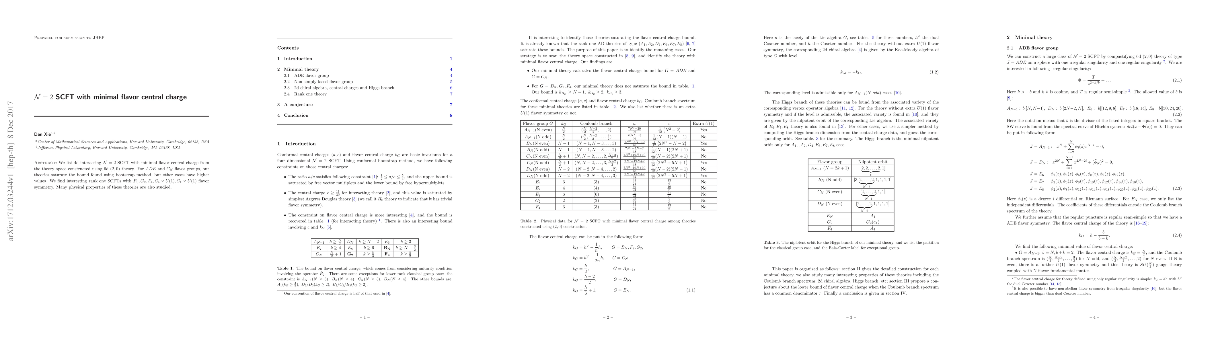 We list 4d interacting $\mathcal{N}=2$ SCFT with minimal flavor central charge from the theory space constructed using 6d $(2,0)$ theory. For $ADE$ and $C_N$ flavor groups, our theory saturates the bound found using bootstrap method, but other cases have higher values. We find interesting rank one SCFTs with $B_3, G_2, F_4, C_4\times U(1), C_1\times U(1)$ flavor symmetry. Many physical properties of these theories are also studied.