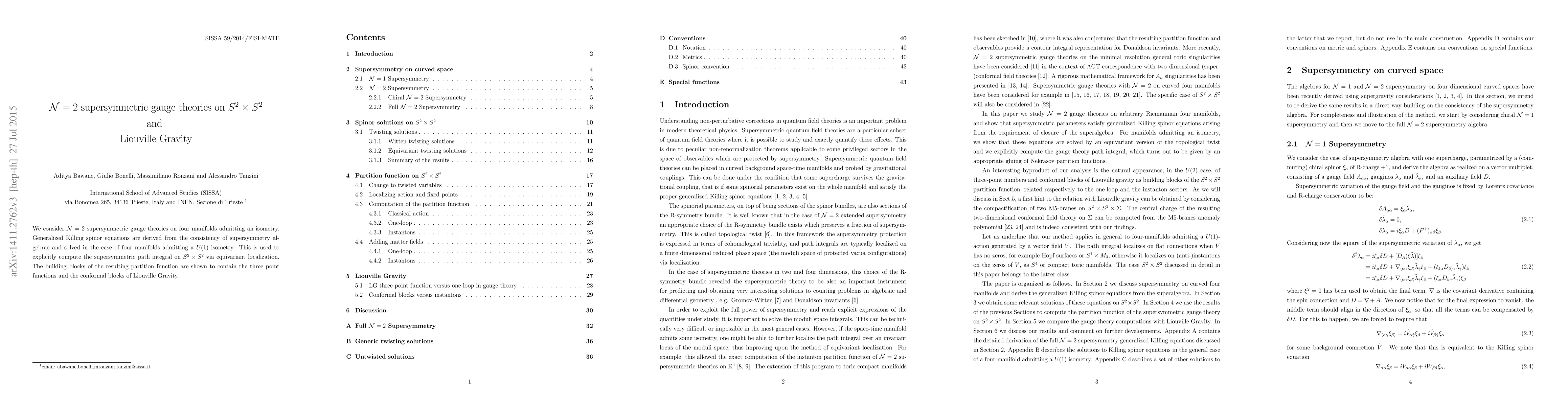 Summary: The paper derives and solves generalized Killing spinor equations for $\mathcal{N}=2$ supersymmetric gauge theories on four-manifolds with $U(1)$ isometry, and uses localization techniques to compute the supersymmetric path integral on $S^2\times S^2$, revealing connections to Liouville Gravity's three point functions and conformal blocks.