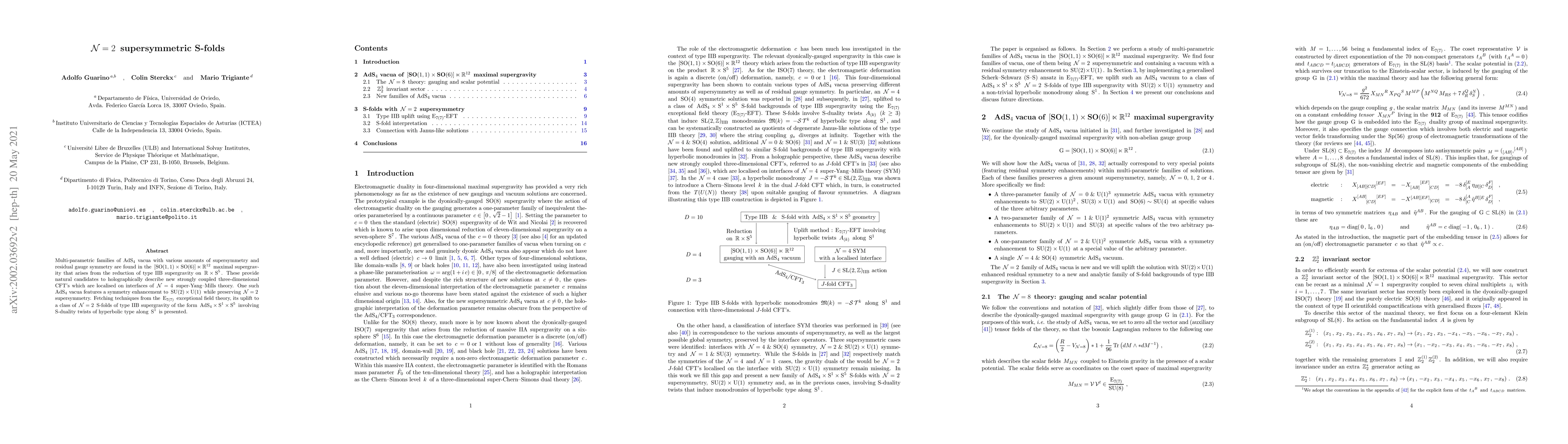 Multi-parametric families of AdS$_{4}$ vacua with various amounts of supersymmetry and residual gauge symmetry are found in the $\,[\textrm{SO}(1,1) \times \textrm{SO}(6)] \ltimes \mathbb{R}^{12}\,$ maximal supergravity that arises from the reduction of type IIB supergravity on $\,\mathbb{R} \times \textrm{S}^5\,$. These provide natural candidates to holographically describe new strongly coupled three-dimensional CFT's which are localised on interfaces of $\,\mathcal{N}=4\,$ super-Yang--Mills theory. One such AdS$_{4}$ vacua features a symmetry enhancement to $\,\textrm{SU}(2) \times \textrm{U}(1)\,$ while preserving $\,\mathcal{N}=2\,$ supersymmetry. Fetching techniques from the $\,\textrm{E}_{7(7)}\,$ exceptional field theory, its uplift to a class of $\,\mathcal{N}=2\,$ S-folds of type IIB supergravity of the form $\,\textrm{AdS}_{4} \times \textrm{S}^{1} \times \textrm{S}^5\,$ involving S-duality twists of hyperbolic type along $\,\textrm{S}^{1}\,$ is presented.