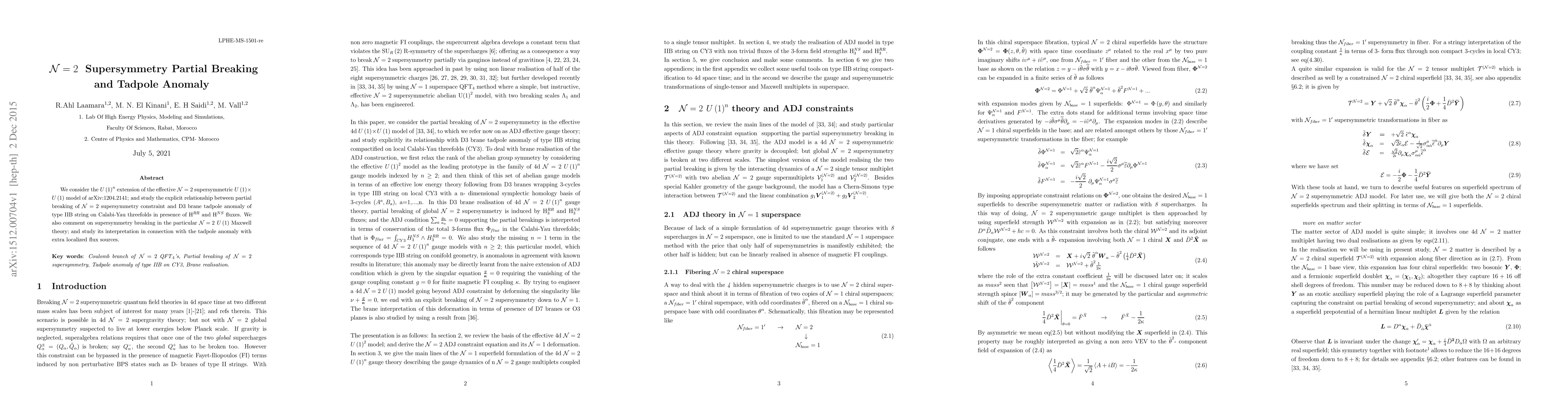 We consider the $U(1) ^{n}$ extension of the effective $\mathcal{N}=2$ supersymmetric $U(1) \times U(1) $ model of $arXiv:1204.2141$; and study the explicit relationship between partial breaking of $\mathcal{N}=2$ supersymmetry constraint and D3 brane tadpole anomaly of type IIB string on Calabi-Yau threefolds in presence of H$^{RR}$ and H$^{NS}$ fluxes. We also comment on supersymmetry breaking in the particular $\mathcal{N}=2$ $U(1) $ Maxwell theory; and study its interpretation in connection with the tadpole anomaly with extra localized flux sources.