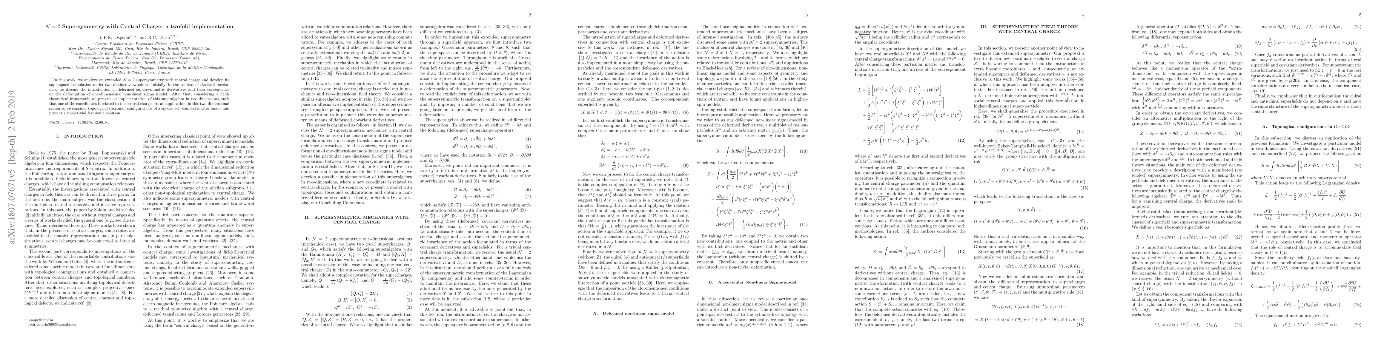 In this work, we analyze an extended $\mathcal{N}=2$ supersymmetry with central charge and develop its superspace formulation under two distinct viewpoints. Initially, in the context of classical mechanics, we discuss the introduction of deformed supersymmetric derivatives and their consequence on the deformation of one-dimensional non-linear sigma model. After that, considering a field-theoretical framework, we present an implementation of this superalgebra in two dimensions, such that one of the coordinates is related to the central charge. As an application, in this two-dimensional scenario, we consider topological (bosonic) configurations of a special self-coupled matter model and present a non-trivial fermionic solution.