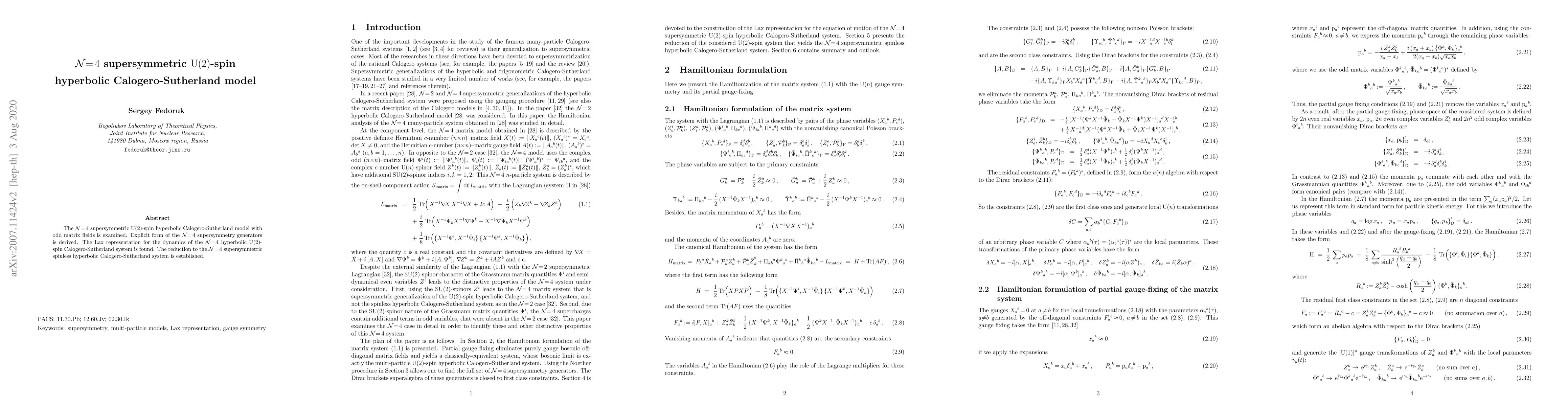 The $\mathcal{N}{=}\,4$ supersymmetric $\mathrm{U}(2)$-spin hyperbolic Calogero-Sutherland model with odd matrix fields is examined. Explicit form of the $\mathcal{N}{=}\,4$ supersymmetry generators is derived. The Lax representation for the dynamics of the $\mathcal{N}{=}\,4$ hyperbolic $\mathrm{U}(2)$-spin Calogero-Sutherland system is found. The reduction to the $\mathcal{N}{=}\,4$ supersymmetric spinless hyperbolic Calogero-Sutherland system is established.